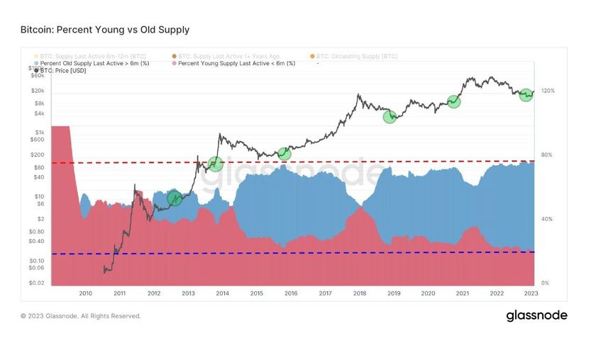 Moreover, the percentage difference between old and young supply is currently the highest in history (ATH). When in previous cycles there were dramatic increases in the old supply chart. This signaled the start of a bull market (green circles).