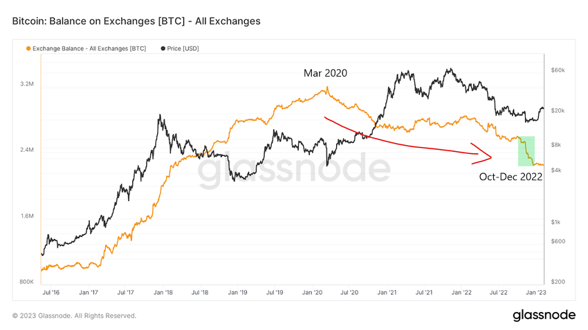 If the trend on the STH and LTH charts continues, it could trigger a Bitcoin supply crisis and a lack of availability on exchanges. Moreover, the chart of the BTC balance on exchanges shows that there has been a steady outflow of Bitcoin since March 2020. Moreover, especially in October-December 2022, there was a dramatic decrease in BTC held on exchanges (green area).