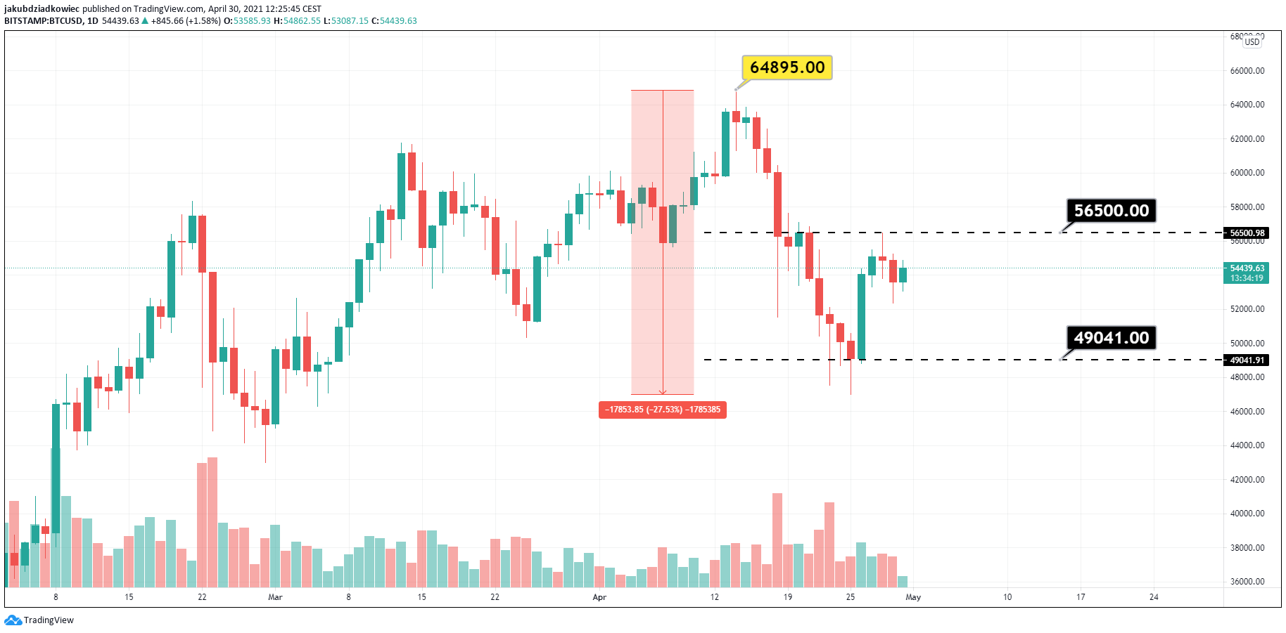 Last week, there was a continuation of the drop in the price of Bitcoin (BTC) and a clear bounce. From an all-time high of $64,895 on April 14 to a low of $47,000 on April 25, BTC lost 27.5% of its value.