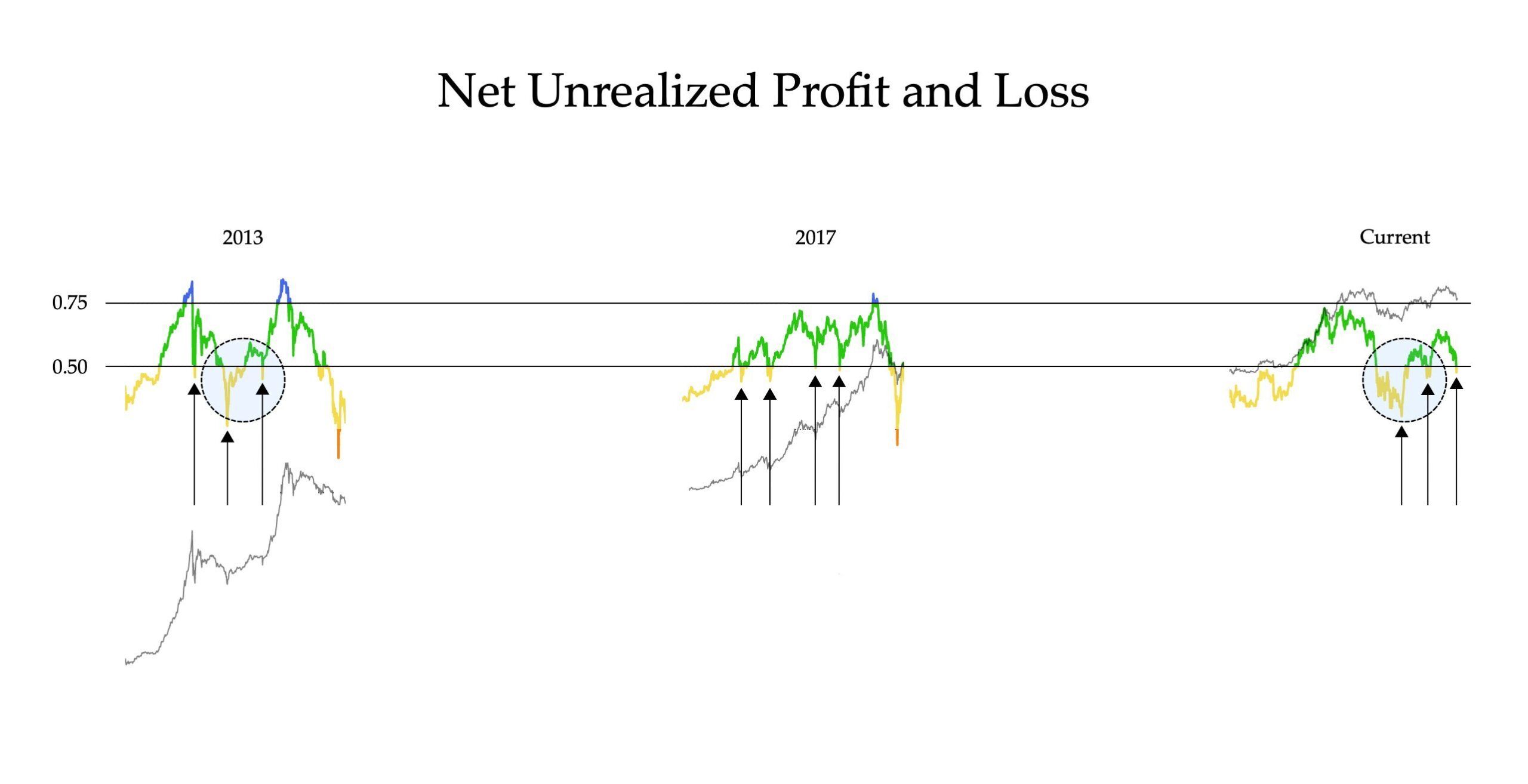 SponsoredFrom the point of view of the integrity of Bitcoin’s bull market, a rapid return to the green range above 0.5 seems important. The current structure resembles the analogous periods of previous BTC cycles of Oct 2 2013 and Sept 14, 2017 (red arrows).