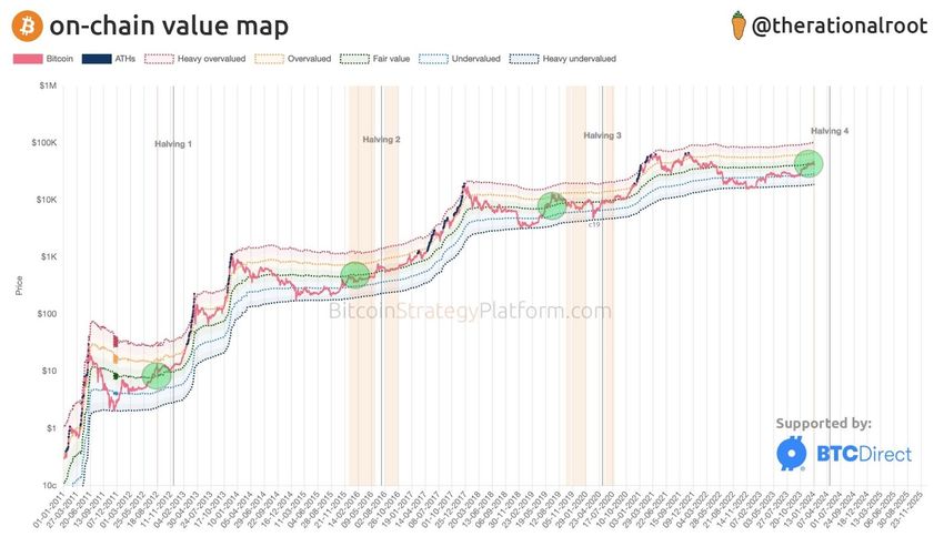 In his post on X (Twitter), the analyst emphasizes that Bitcoin has just returned to the green “fair value” area. He goes on to mention that achieving this level in the past correlated with a period of sideways trending. This one occurred around halving and signaled a phase of accumulation before a mature bull market. However, a moment later, he adds: