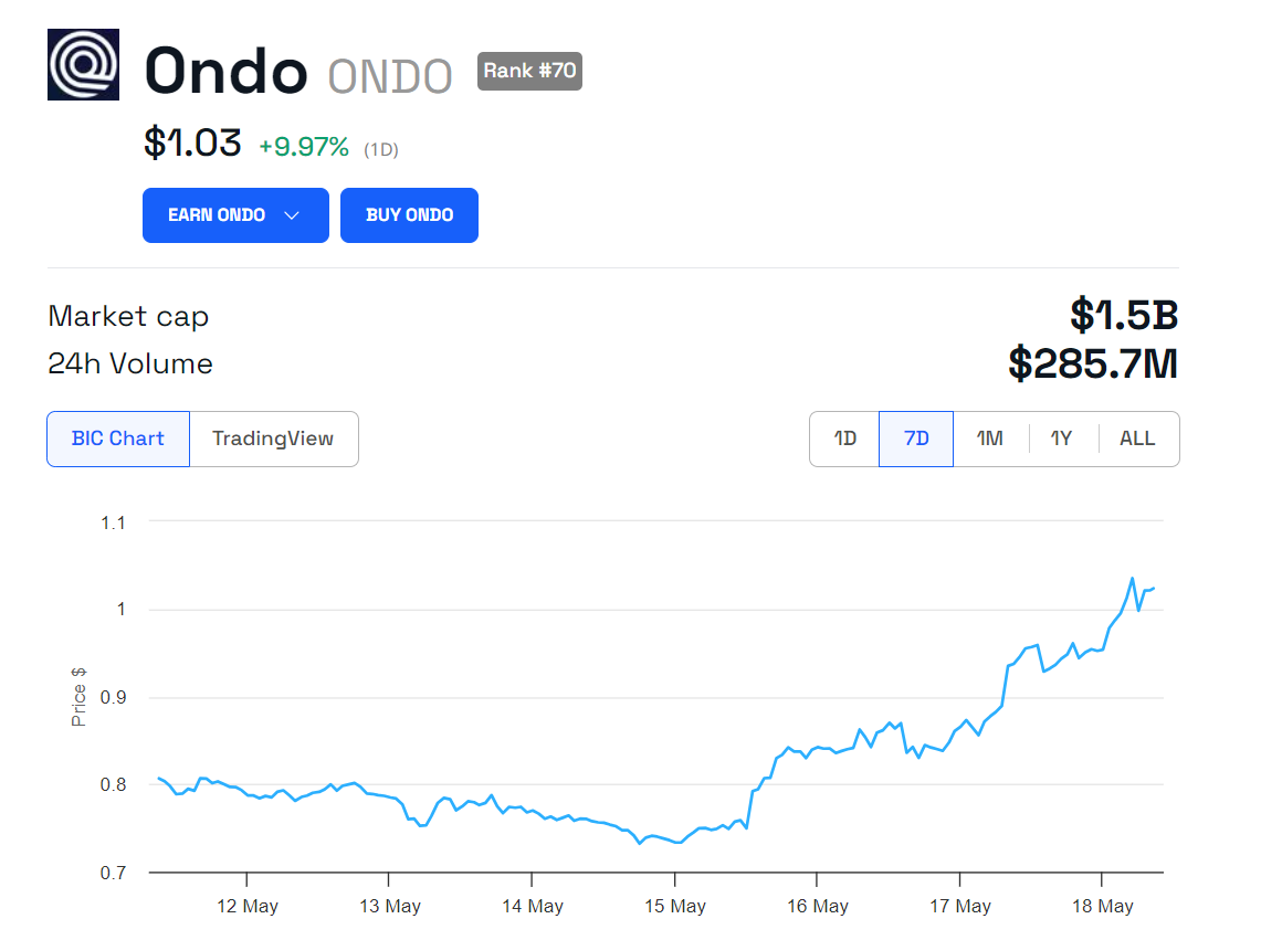 However, ONDO is trading at $1.03 at the time of writing. The figure marks a 9.9% increase over the last 24 hours and a 26.3% rise in the past week.