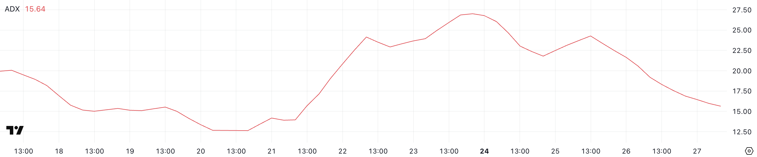 It goes from 0 to 100, with values above 25 signaling a strong trend and values below 20 indicating a weak or non-trending market.