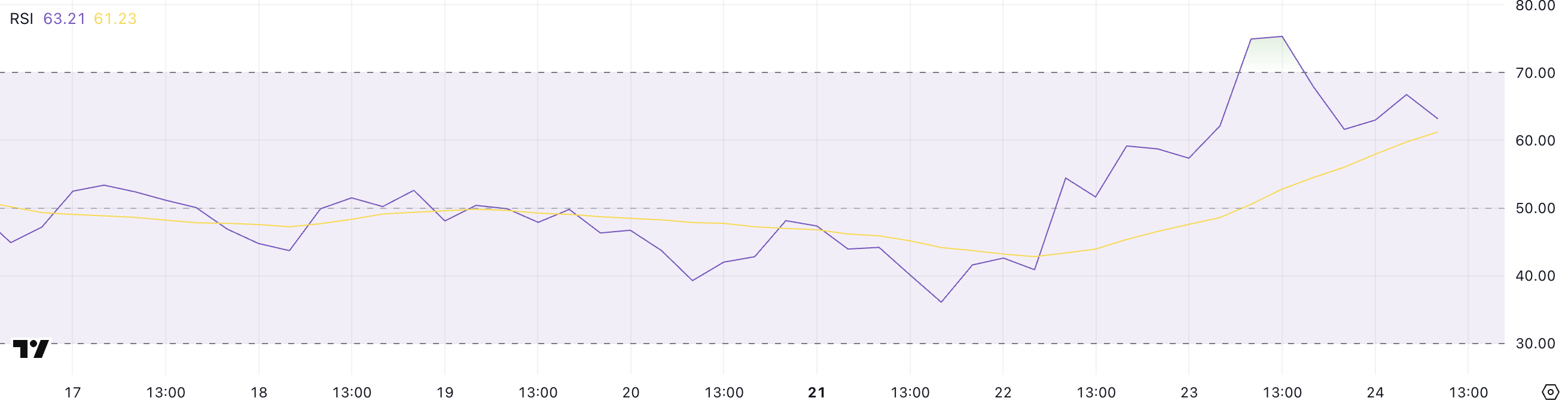 While the move initially indicated overbought conditions, today’s dip to 63.21 suggests that momentum is easing, although it remains in bullish territory.