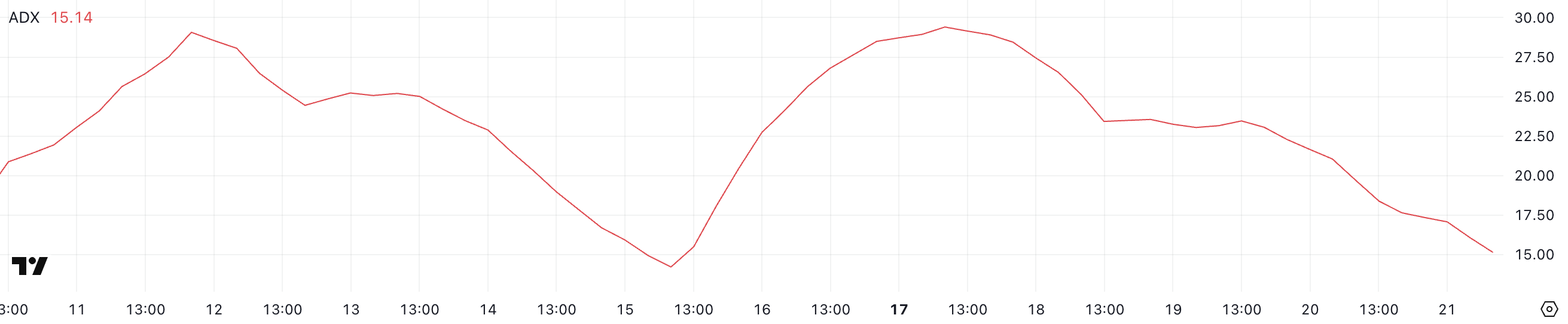 Onyxcoin, which is built on Arbitrum, currently has an Average Directional Index (ADX) of 15.1 after reaching a peak of 29.4 just four days ago. Since then, the ADX has been declining steadily, indicating a weakening trend.
