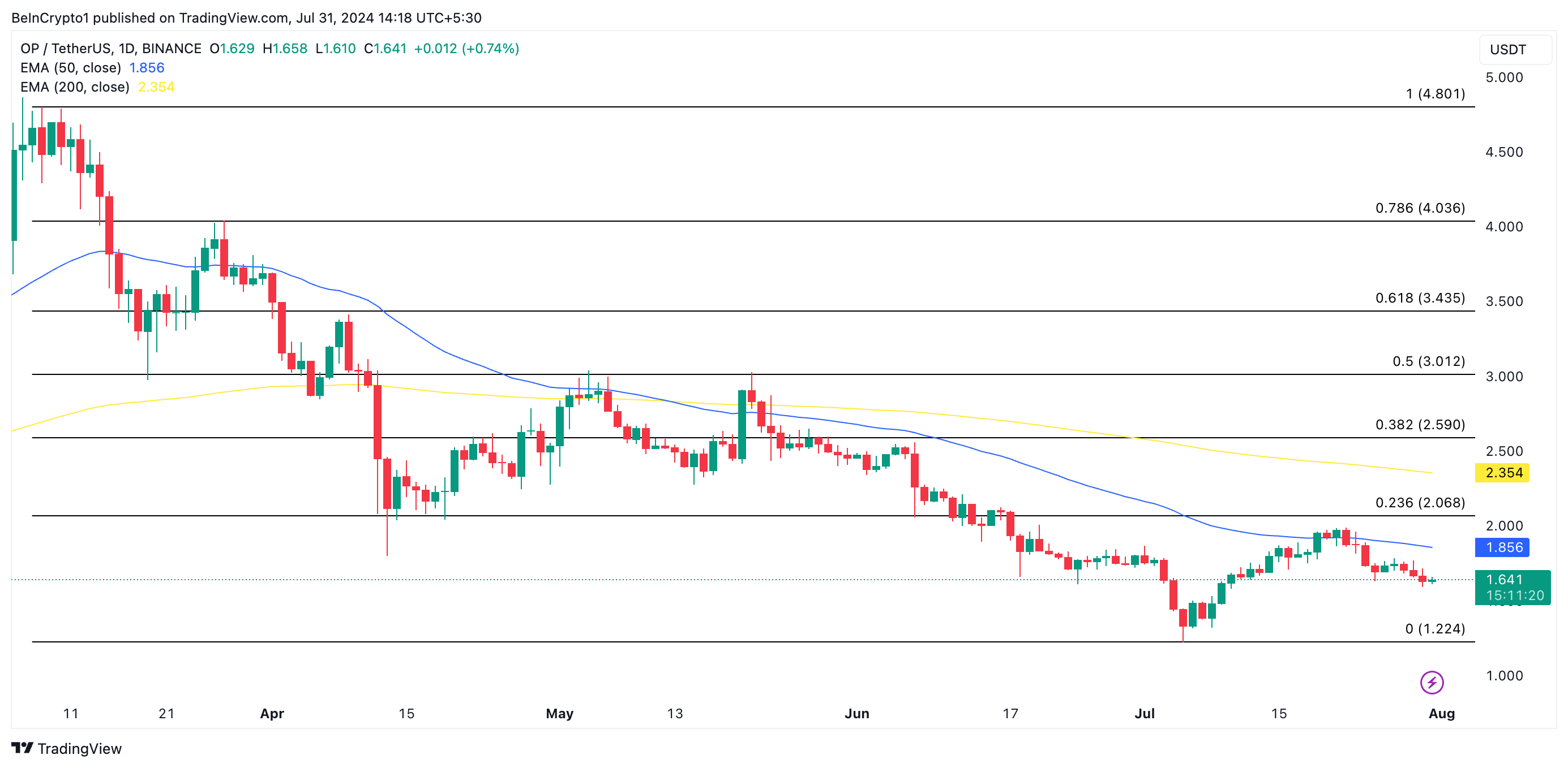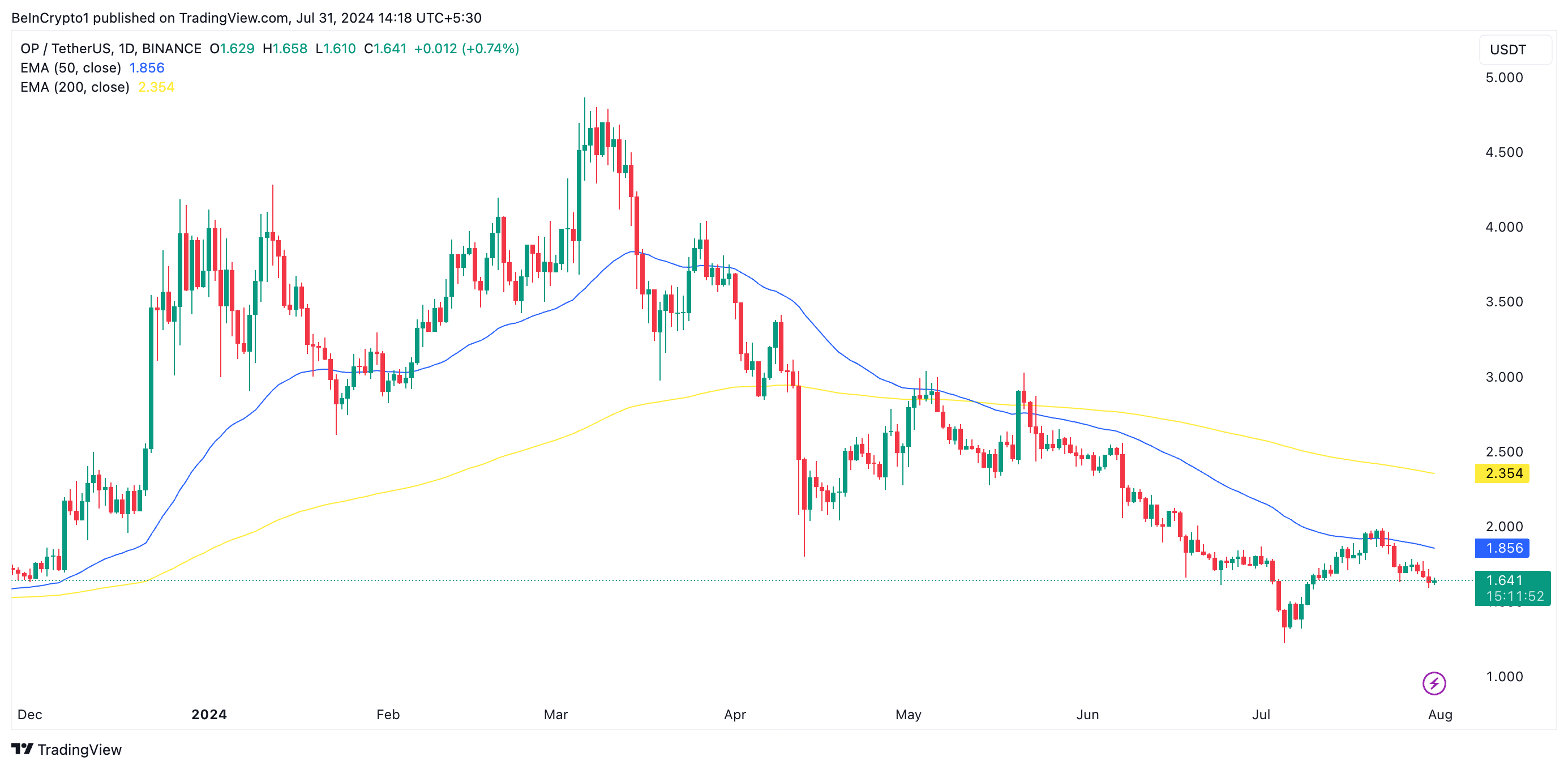 An assessment of OP’s price movements on a one-day chart reveals that its 50-day exponential moving average (EMA) (blue line) crossed below its 200-day EMA (yellow line) on May 12 and has since trended further from it.