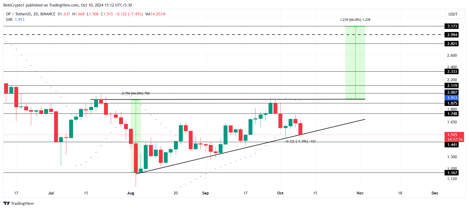 The pattern offers a possible 64% rally, with the target price at $3.17. For this rally to be confirmed, OP would need to rise beyond $2.00 and flip it into support. Finally, a breach of this key level would indicate stronger upward momentum and solidify the bullish case.