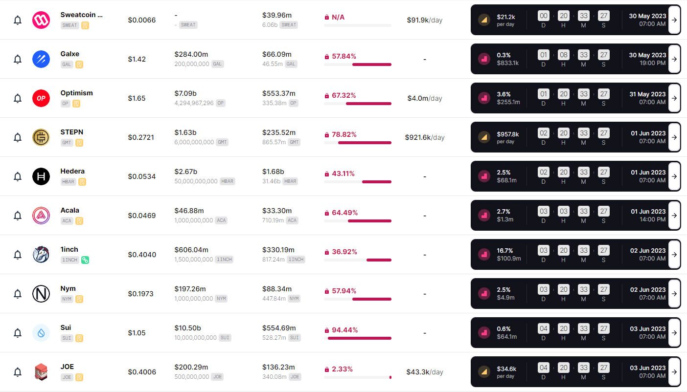 On May 30, there will be releases for Sweatcoin (SWEAT) and Galxe (GAL). Sweatcoin unlocks around 3.2 million tokens per day, while Galxe will release 586,666 tokens.