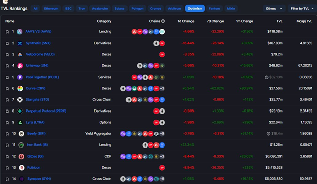 Other dApps that made significant contributions to TVL include Synthetix, Velodrome, Stargate, and Perpetual Protocol.