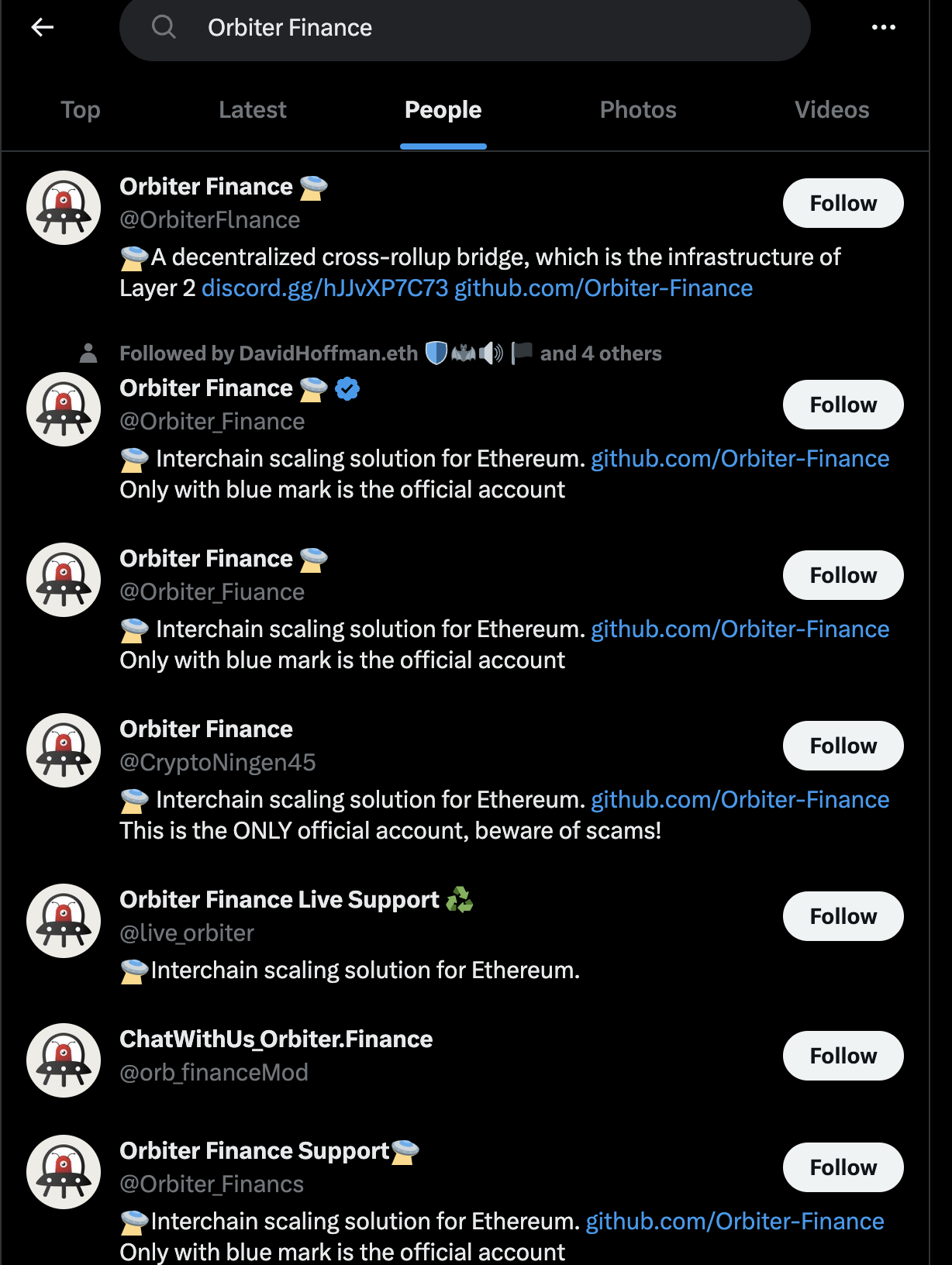 The scam in space has grown so rampant that a normal search of the “Orbiter Finance” project shows a list full of fake accounts. The accounts have also jacked up their follower count, which might trick users who do not do proper due diligence.
