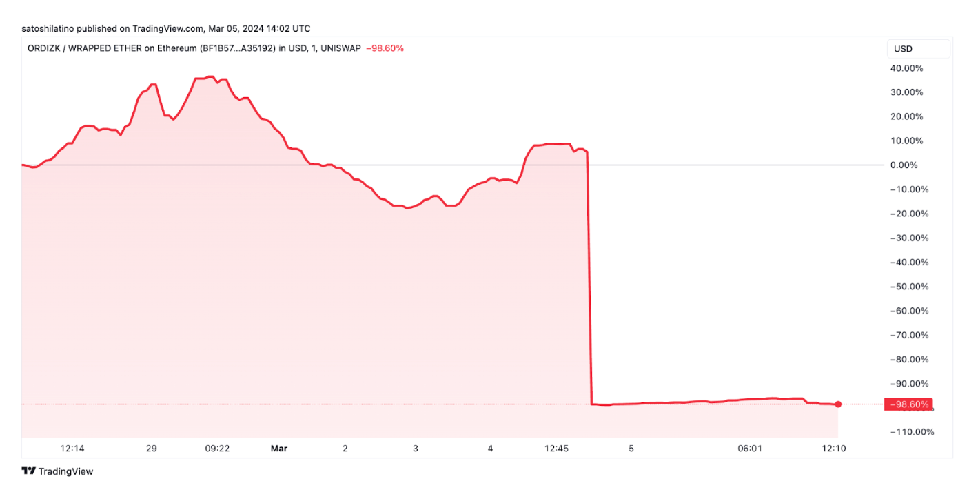 “We have seen an exit scam on OrdiZK. Website and social media accounts have been deleted. The deployer holds around $1 million worth of ETH from dumping tokens, removing ETH from project contracts, and taxes from sales,” blockchain security company Certik said.