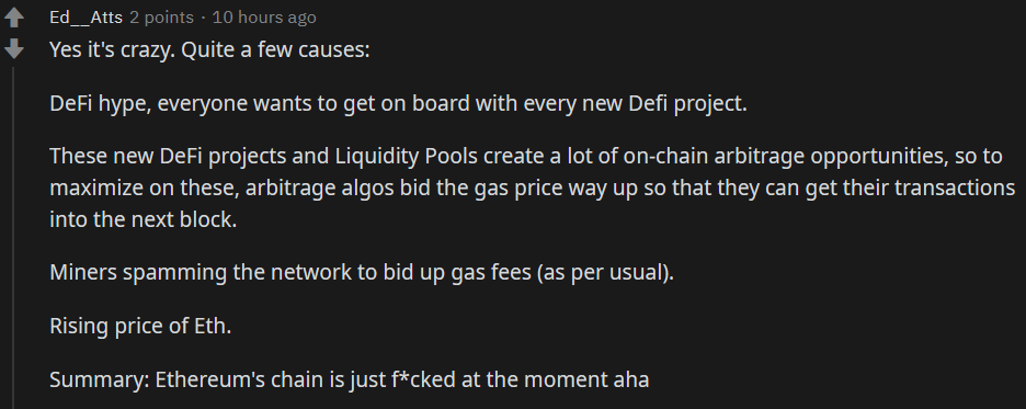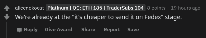 Some Reddit users have pointed out that high ETH fees contradict the purpose of fast, trustless transactions. With wait times like these, some have argued, it would be faster and cheaper to send a check with overnight shipping.