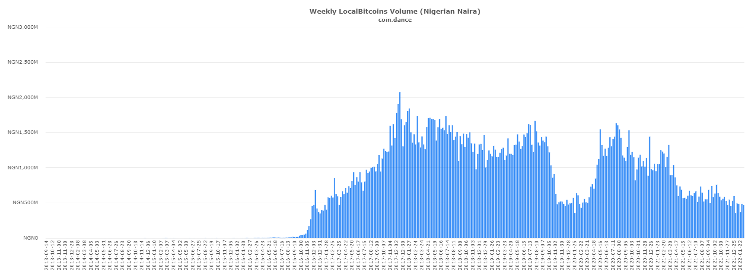 Data from LocalBitcoins and Paxful show that peer-to-peer trading of bitcoin in Nigeria has increased by over 15% year-over-year since the country’s central bank enforced a crypto ban. Current weekly bitcoin trading volumes are at a slight lull, probably because of the downturn in the market.