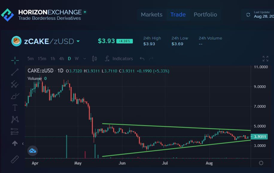The DeFi platform @HorizonProtocol tweeted a chart of CAKE which shows a symmetrical triangle that has been in place since May.Â