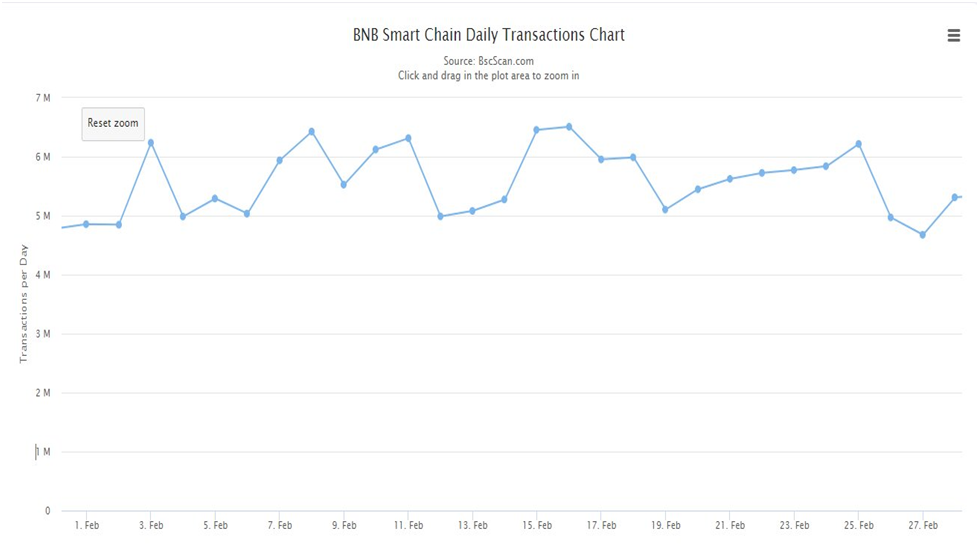 Declining transaction counts on the Binance Smart Chain, buoyed by the Russian/Ukraine Crisis towards the end of February can be attributed to as the primary factor for the fall in total trading volume.
