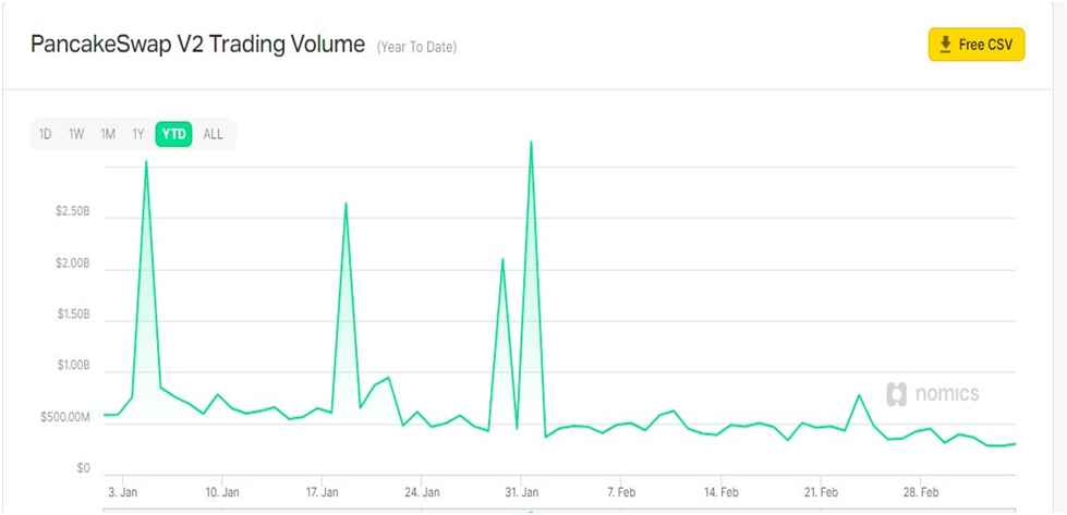 PancakeSwap (CAKE) responded negatively to the bearish outlook of the market in February, as total trading volume fell by 37%.