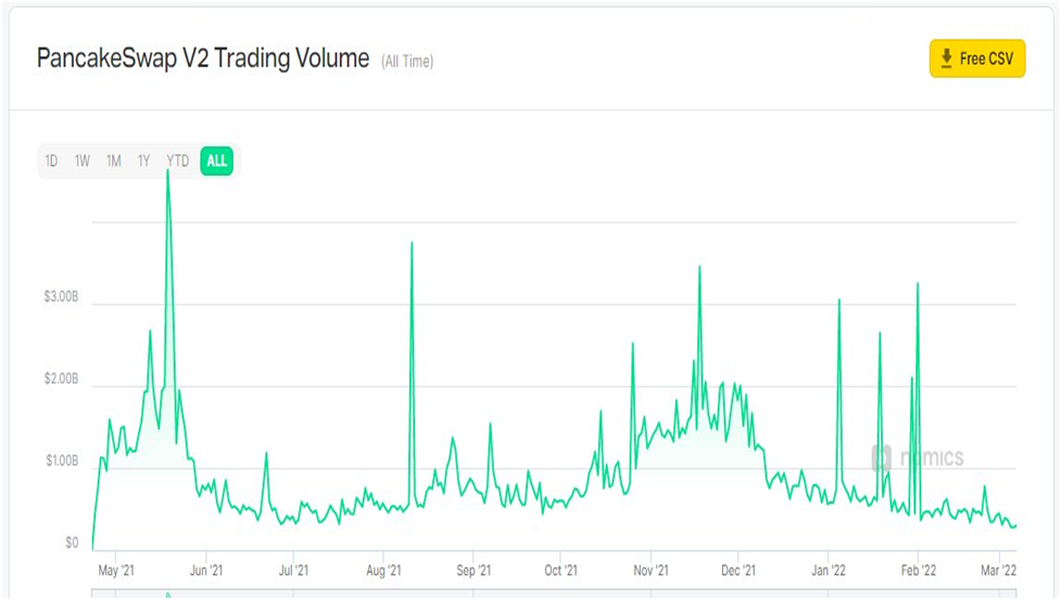 As of writing, the total volume for March 2022 was $2.78 billion and the total transaction on the Binance Smart Chain (still dominated by PancakeSwap) was 34,305,912.