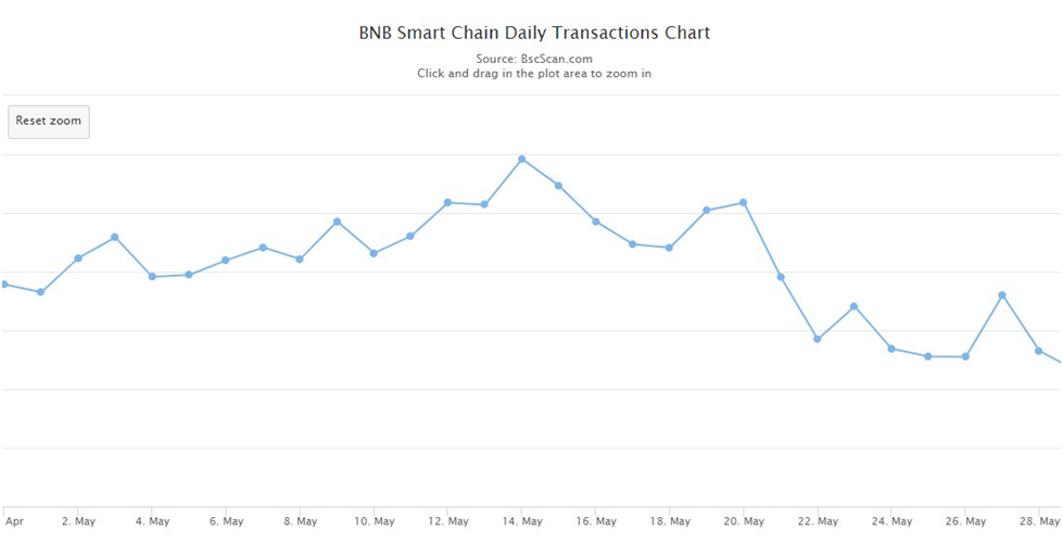 The top ─ performing DAPP in the Binance Smart Chain (BSC) is PancakeSwap. As a result, the DEX is largely responsible for the lion’s share of the total transaction count on the chain. At its peak in May 2021, the total transaction count on the BSC was 247,447,339.