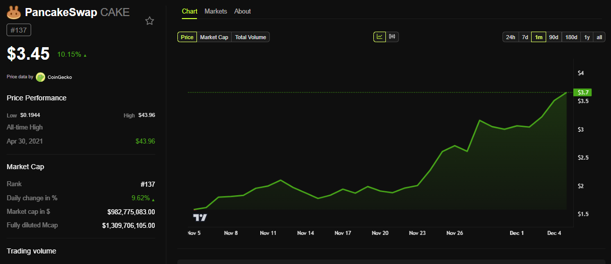 SponsoredPancakeSwap’s CAKE token is up by 10% on this news, trading for $3.45 as of this writing.
