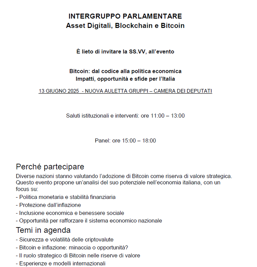 The initiative, titled “Bitcoin: from Code to Economic Policy”, is promoted by the Parliamentary Intergroup on Digital Assets, Blockchain and Bitcoin and marks the official launch of a Parliamentary Task Force dedicated to the sector. The goal is to provide political actors with cultural and informational tools.