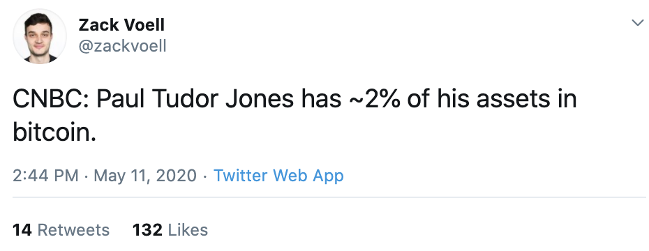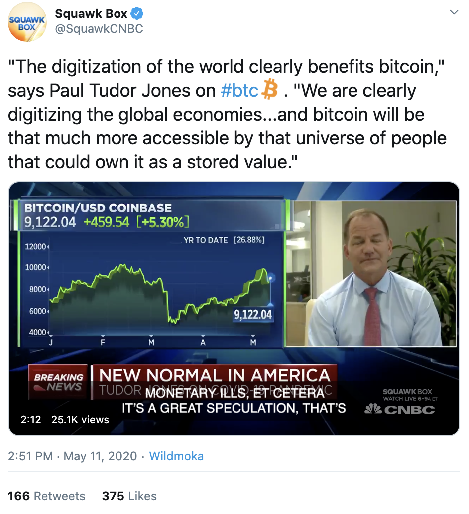 Many cryptocurrency fans were expecting Paul Tudor Jones to make a statement on CNBC today—and indeed, he did, saying: