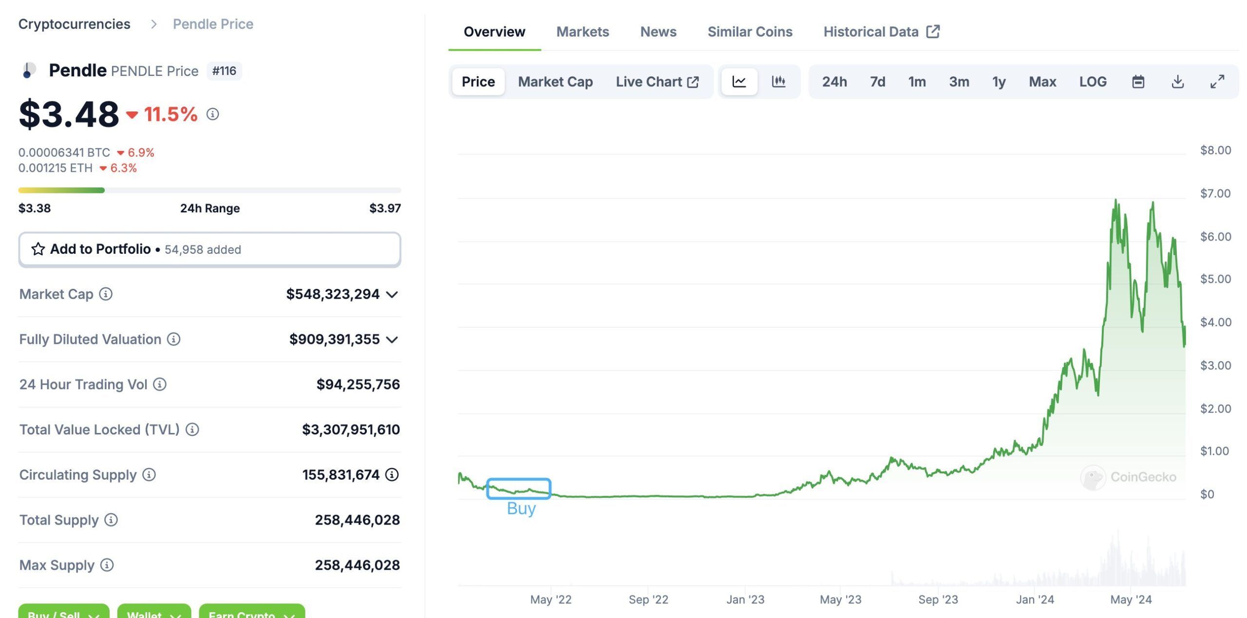 With PENDLE’s current market price, the whale’s investment strategy has paid off significantly. PENDLE has seen substantial growth over the past year. From $0.92 last year, it reached an all-time high of $7.50 in April 2024. However, at the time of writing, PENDLE’s price has stabilized, trading at $3.54 currently.
