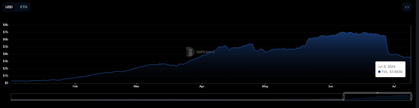 Several markets, including Ether.Fi (eETH) and Renzo’s (ezETH) expired recently, leading to withdrawals. Investors could roll their tokens into new markets, but the incentives were less appealing.