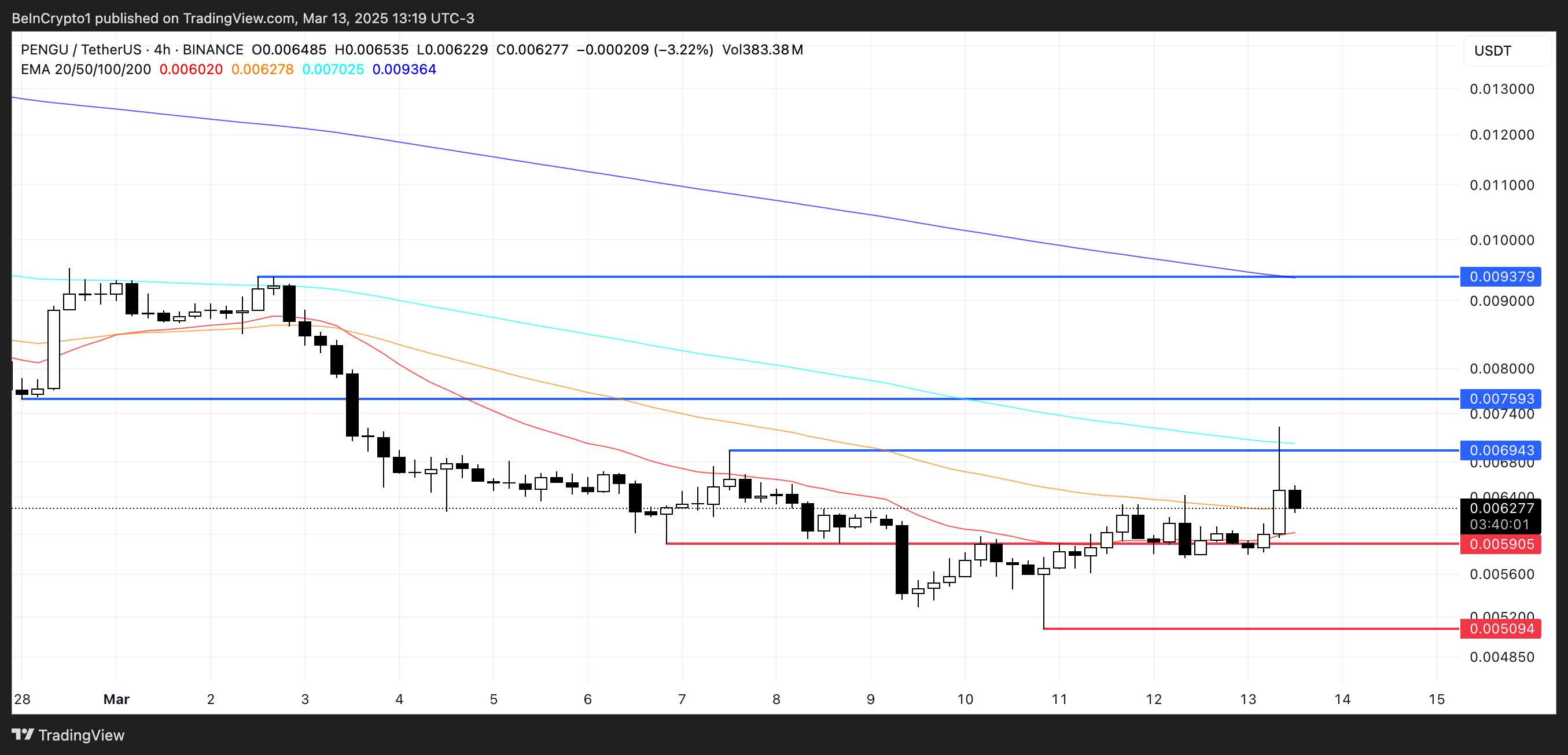 However, if the downtrend resumes and PENGU loses support at $0.0059, selling pressure could push it as low as $0.0050, marking new lows.