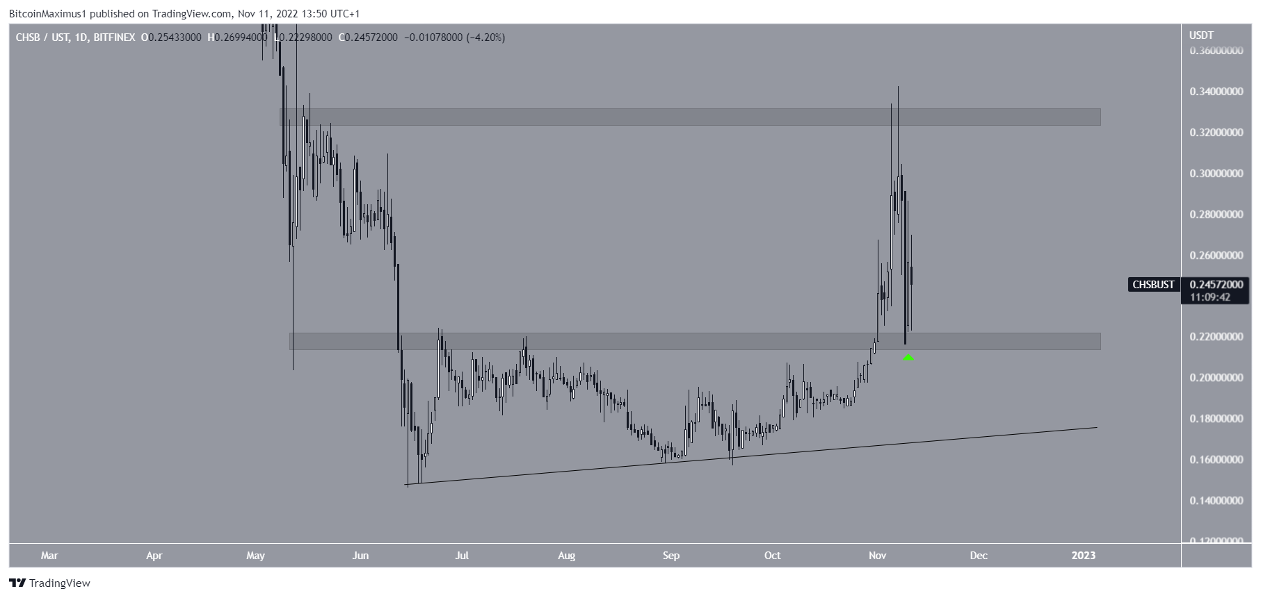 Afterward, during the crypto market decrease of Nov. 7 to 10, the CHSB price returned to the $0.22 area, validating it as support (green icon). As long as it trades above it, the trend can be considered bullish.