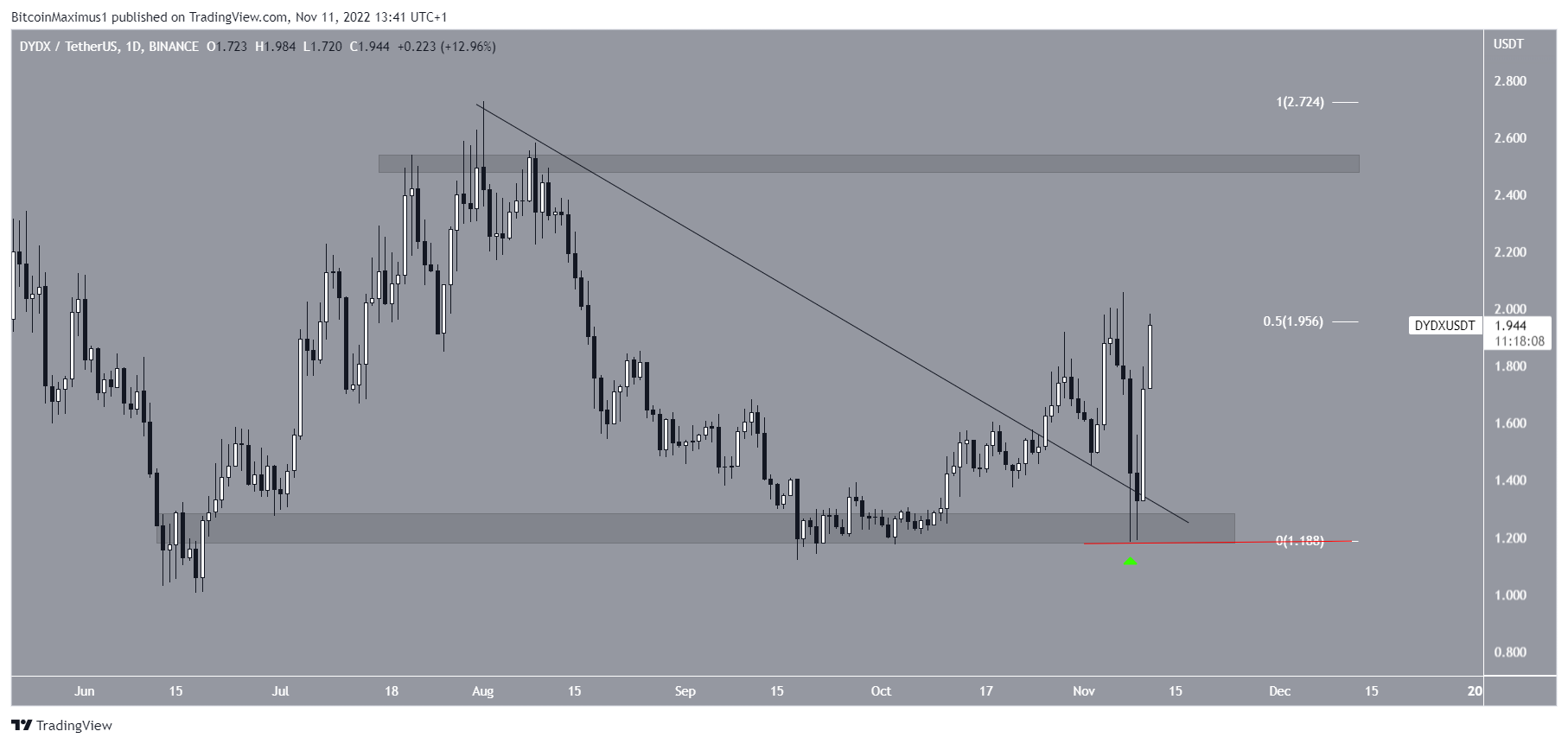 On Oct. 27, DYDX broke out from a descending resistance line that had been in place since Aug. 1. However, it could not sustain the upward movement and returned to the support area once more on Nov. 8.