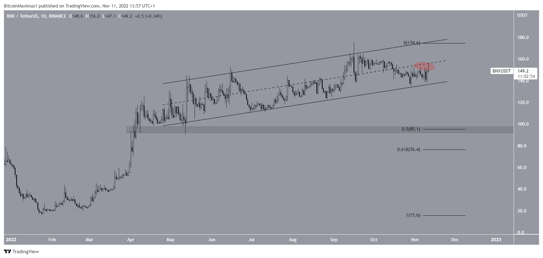 Similar to ANT, BNX is also trading inside an ascending parallel channel. On Oct. 13 and Nov. 11, it was rejected by the middle of the channel (red circle). This is a bearish sign that suggests a breakdown is the most likely scenario.