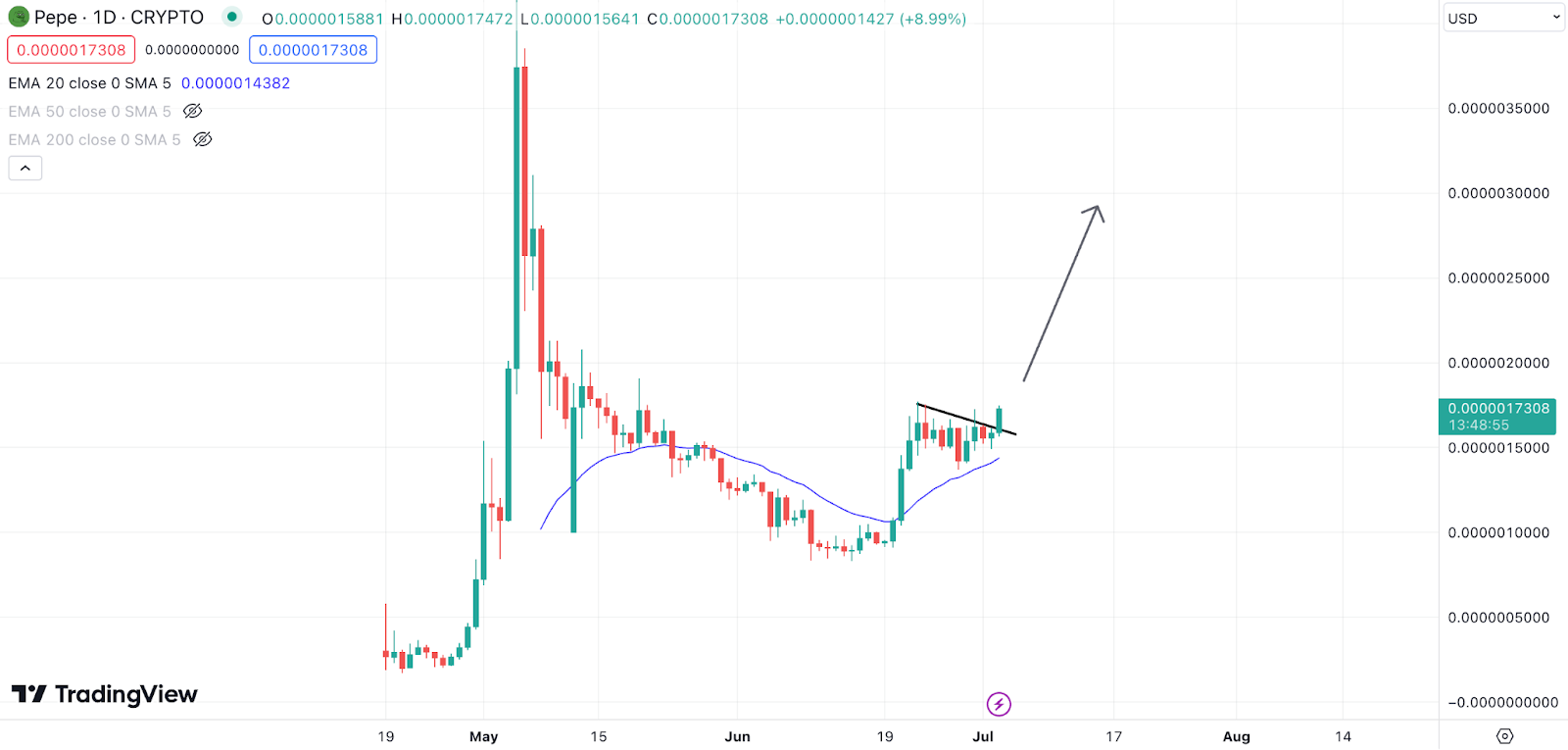 However, more importantly for $PEPE bulls, price has broken out of the bull flag pattern on the daily chart, indicating that a sharp uptrend could occur.