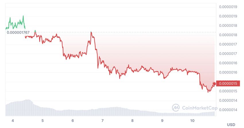 Pepe coin is another meme coin that has gone into a downward spiral. The token has plunged over 5% in the last 24 hours and 18% in the weekly time frame.
