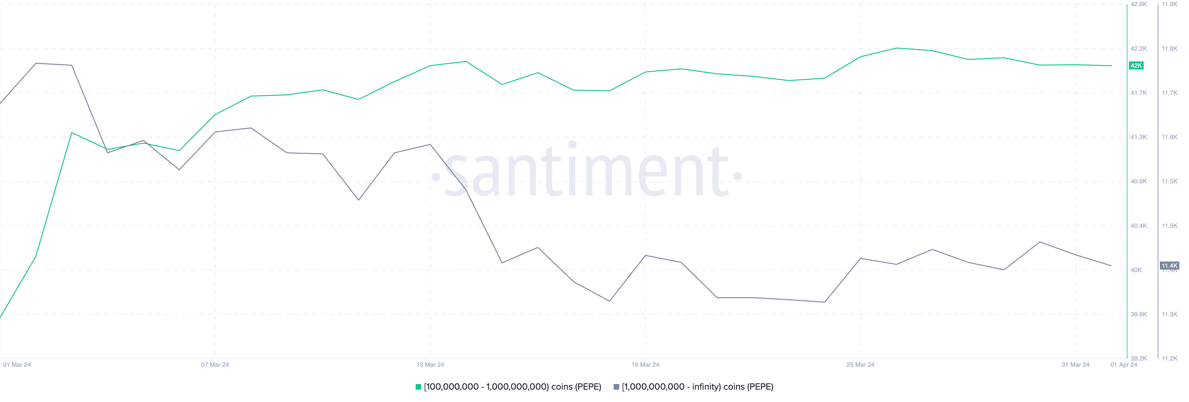 Specifically, the cohort with holdings between 100 million and 1 billion PEPE has seen a slight decrease from 42,129 to 42,042 addresses. Similarly, the segment of investors with more than 1 billion PEPE has marginally diminished from 11,445 to 11,430 addresses.