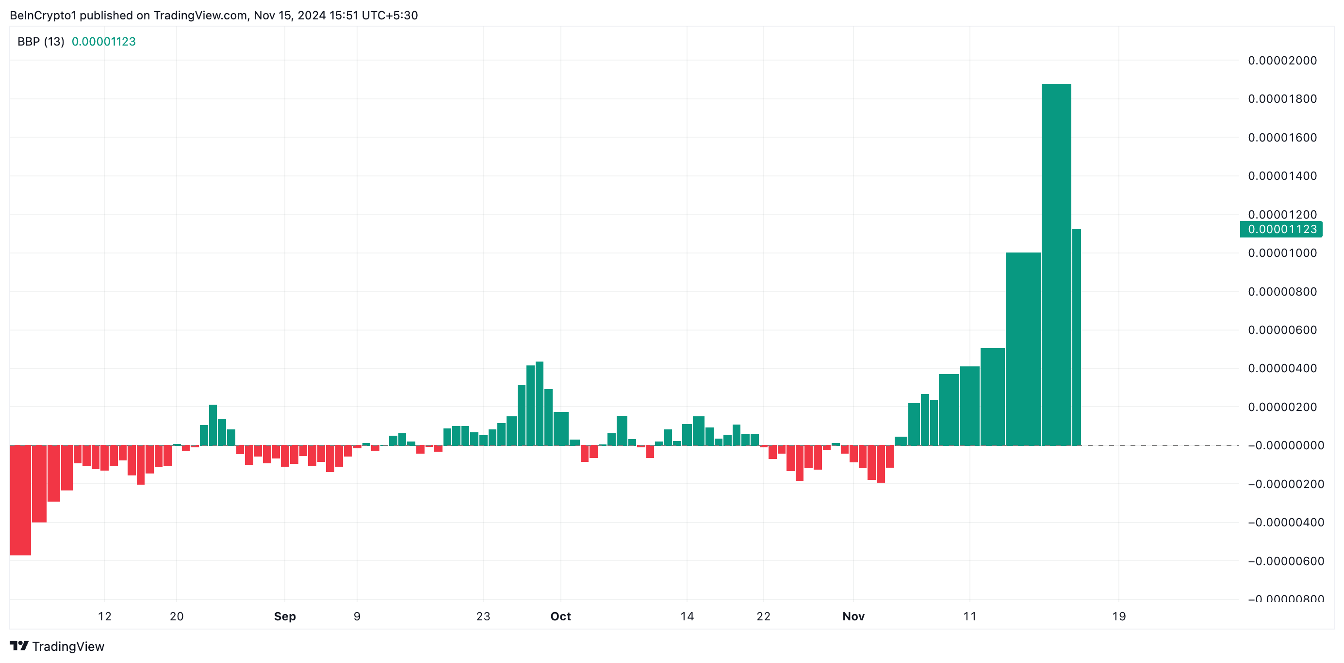 Pepe’s Coinbase listing pushed its price to an all-time high of $0.000025 yesterday, November 14. However, due to the broader market correction, it has witnessed an 8% pullback over the past 24 hours.