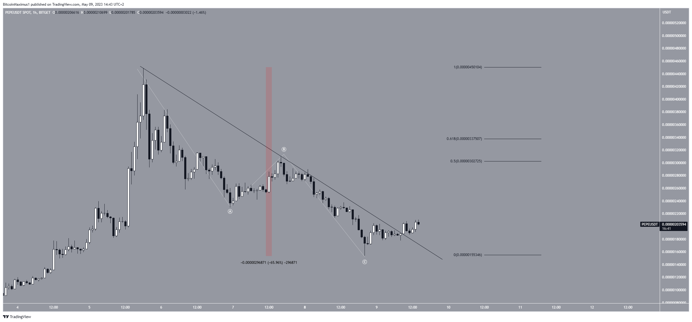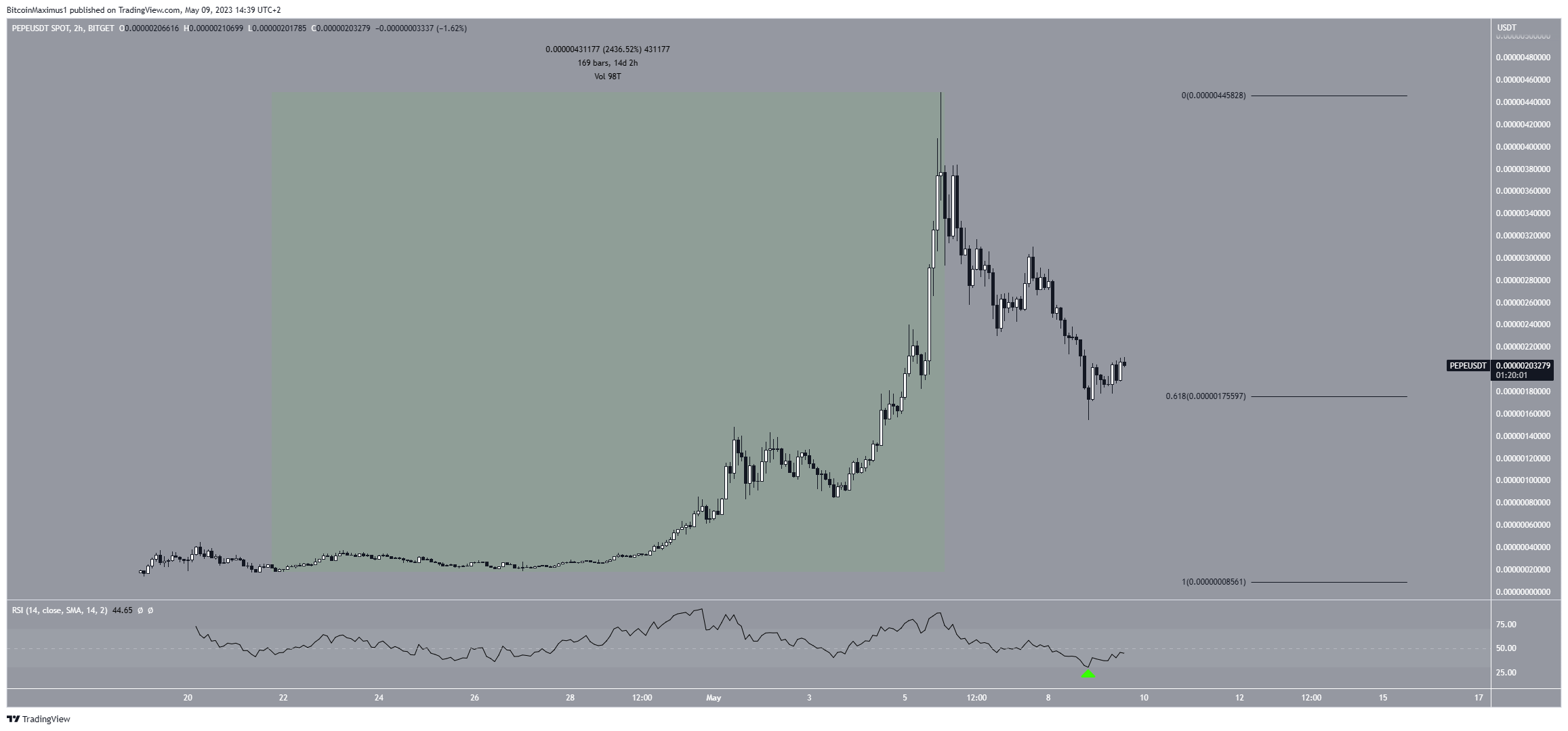 However, PEPE has fallen since, leading to a minimum price of $0.0000018 on May 8, reaching the long-term 0.618 Fib retracement support level.