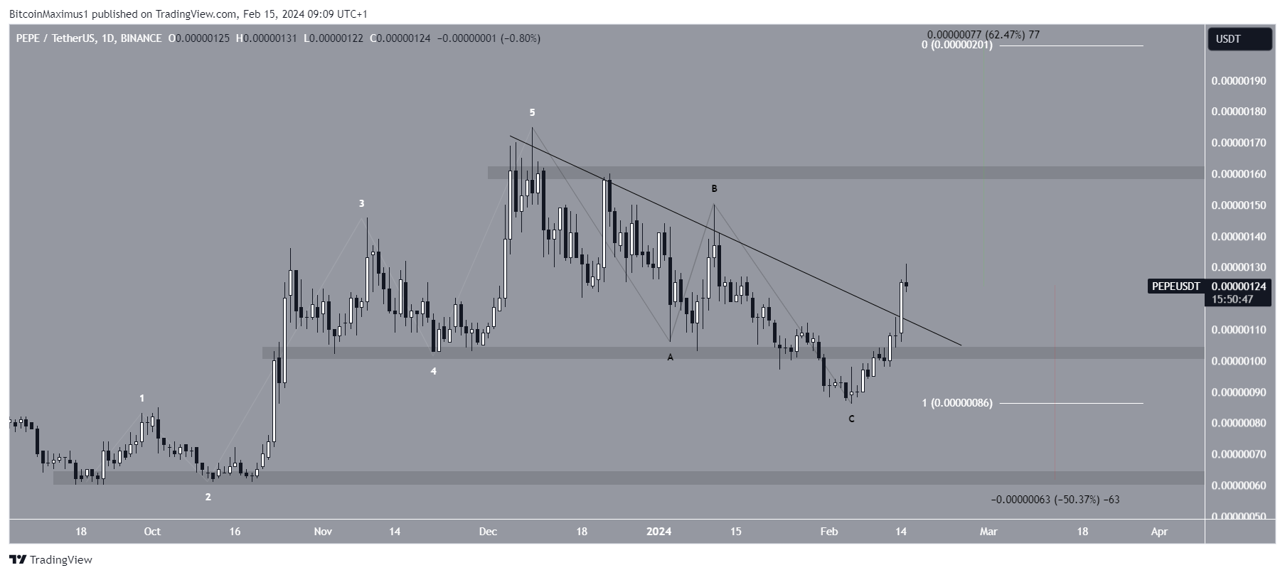 The technical analysis of the daily time frame shows that the PEPE price has fallen under a descending resistance trend line since December 2023. The downward movement led to a low of $0.00000086 on February 5, 2024.