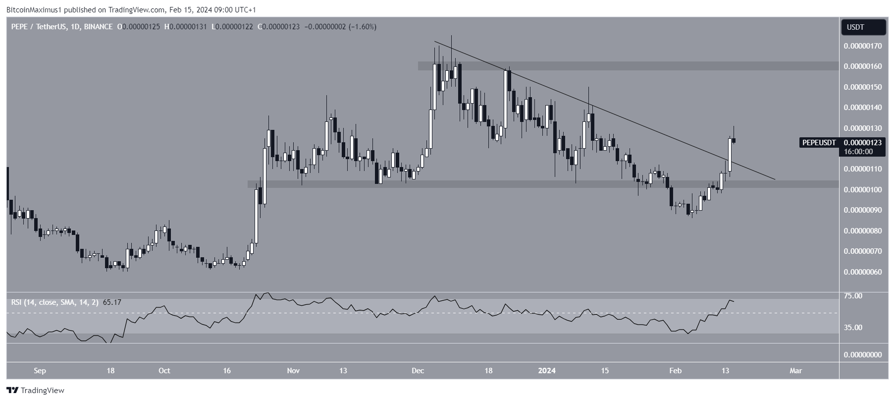 PEPE has increased since, reclaiming the $0.00000100 horizontal area. The price also broke out from a descending resistance trend line, reaching a high of $0.00000131 today.