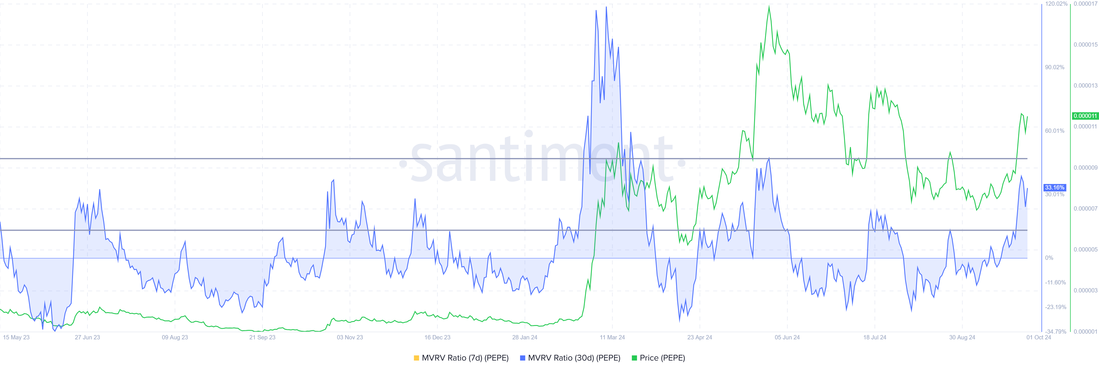 PEPE’s Market Value to Realized Value (MVRV) Ratio at 33% currently sits in the danger zone. The area between 13% and 47% typically signals a heightened risk of corrections. This is because, at these levels, a large number of investors are in profit, which could lead to widespread selling. When profits become abundant, investors often move to lock in gains, putting downward pressure on the price.