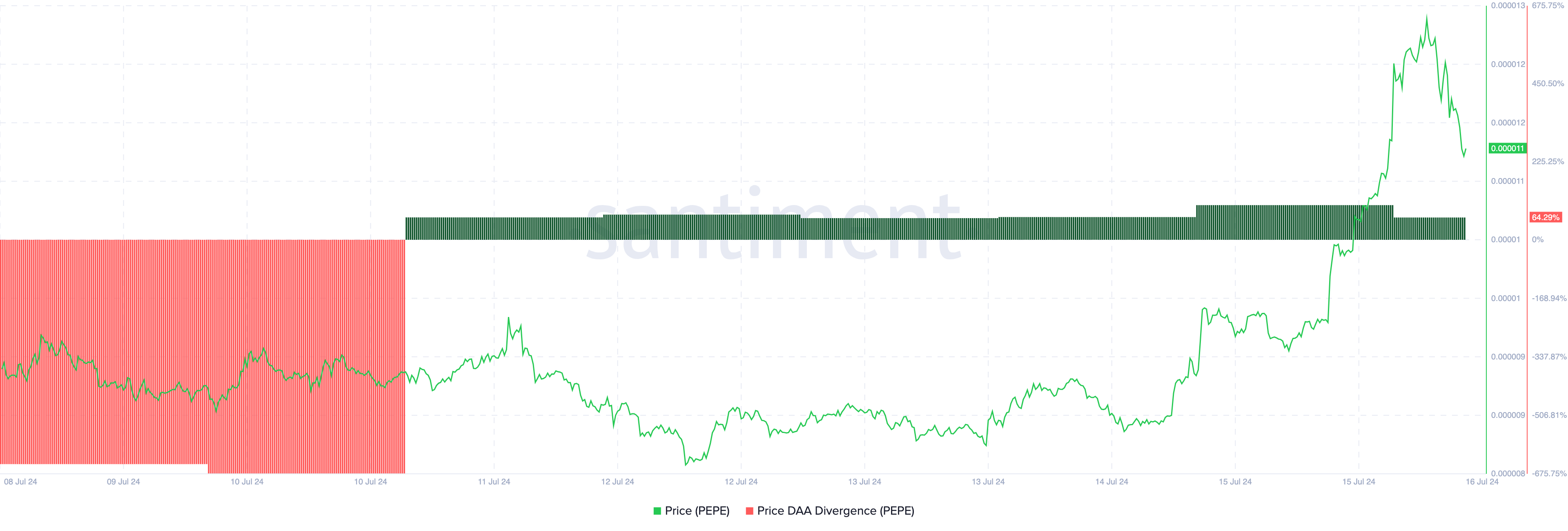 According to Santiment, the price-DAA divergence is one reason PEPE’s price increased. DAA stands for Daily Active Addresses and measures unique user interaction with a cryptocurrency.