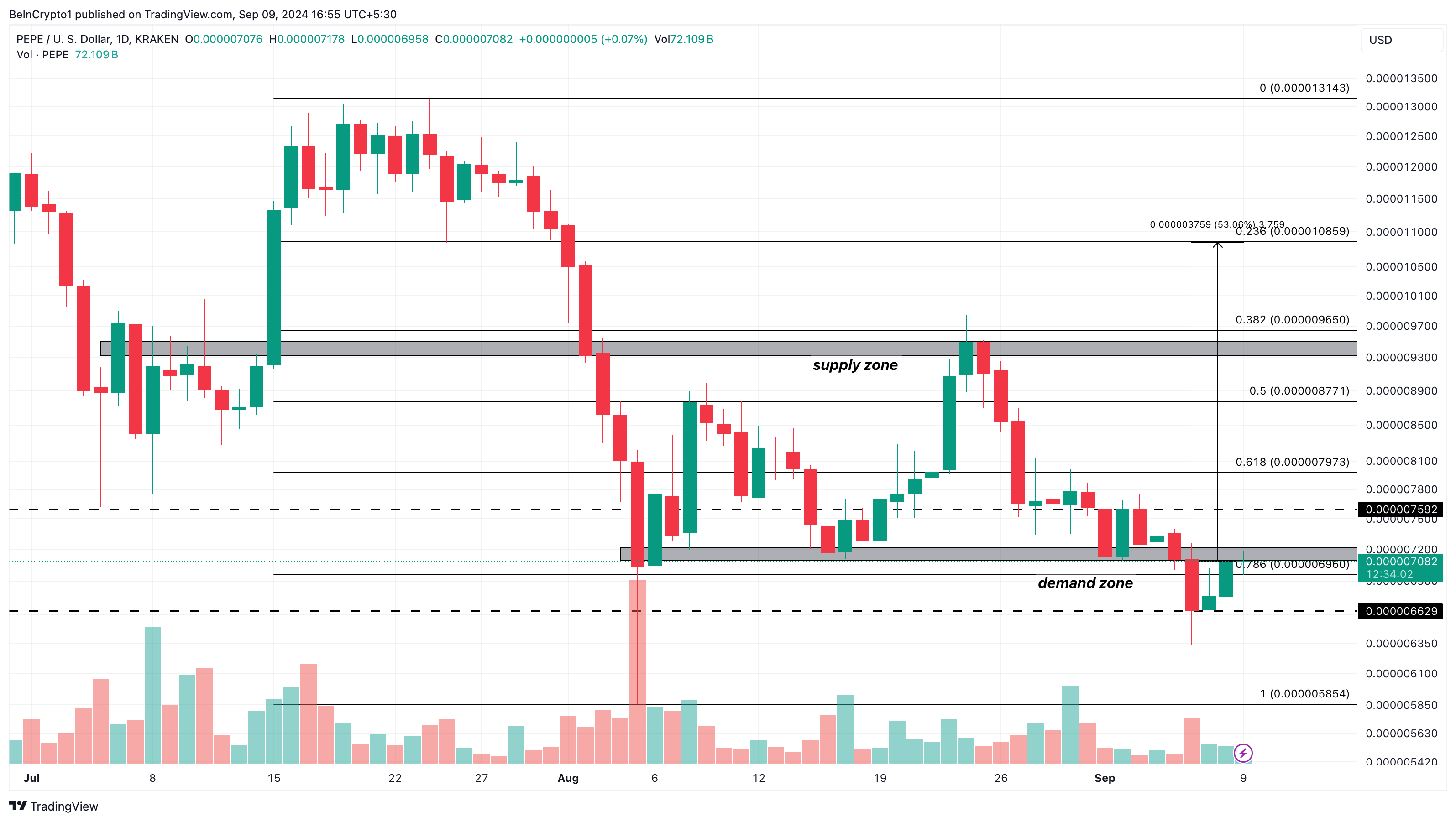 On the daily chart, BeInCrypto noted that PEPE’s price broke out of its downtrend over the weekend, moving from $0.0000066 to $0.0000070. Currently trading at $0.0000070, PEPE is in a demand zone that previously pushed its price from $0.0000070 to $0.0000087 between August 5 and 8.