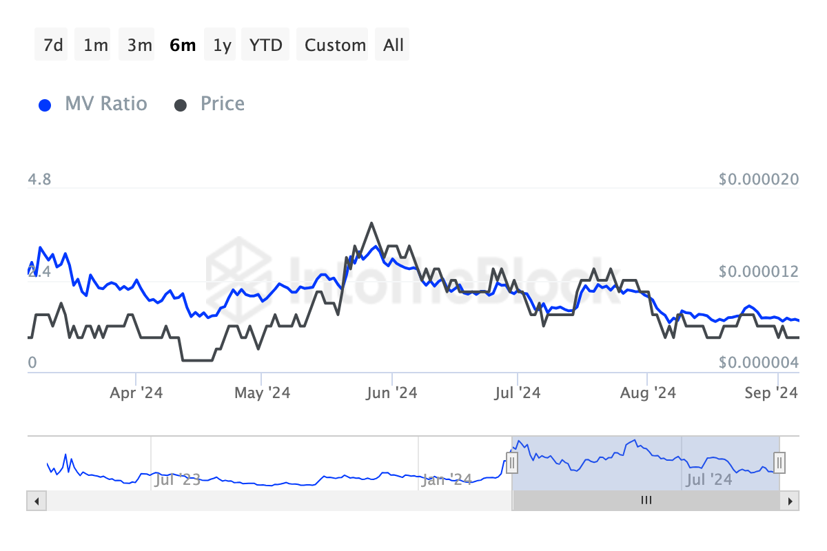 On May 28, the MVRV ratio peaked at 3.29, aligning with PEPE’s all-time high and signaling a market top. The current ratio of 1.34, with PEPE priced at $0.0000071, suggests that the token may have reached a bottom.