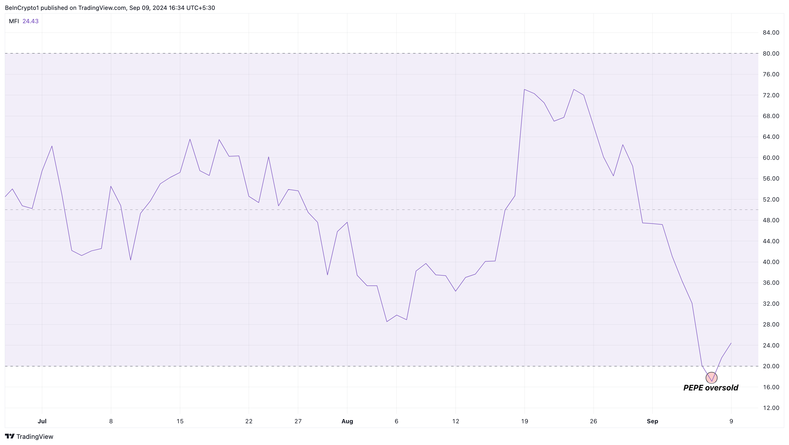 SponsoredOn September 7, the MFI dropped to 17.25, marking PEPE as oversold. As of now, the MFI has risen slightly, indicating that a potential bullish reversal may be forming.