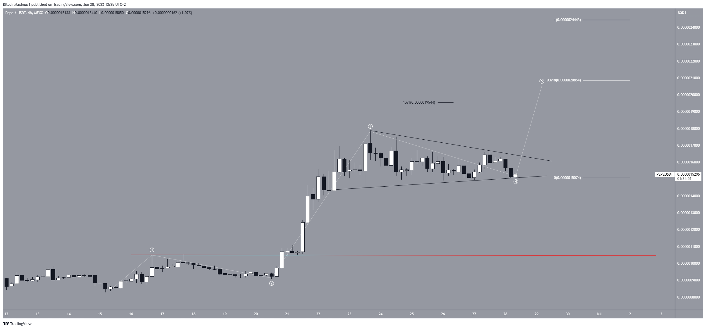 The wave count shows that the PEPE price has been mired in a five-wave upward movement since June 15 (white). If so, it is currently in wave four, which is corrective. Wave four has taken the shape of a symmetrical triangle.