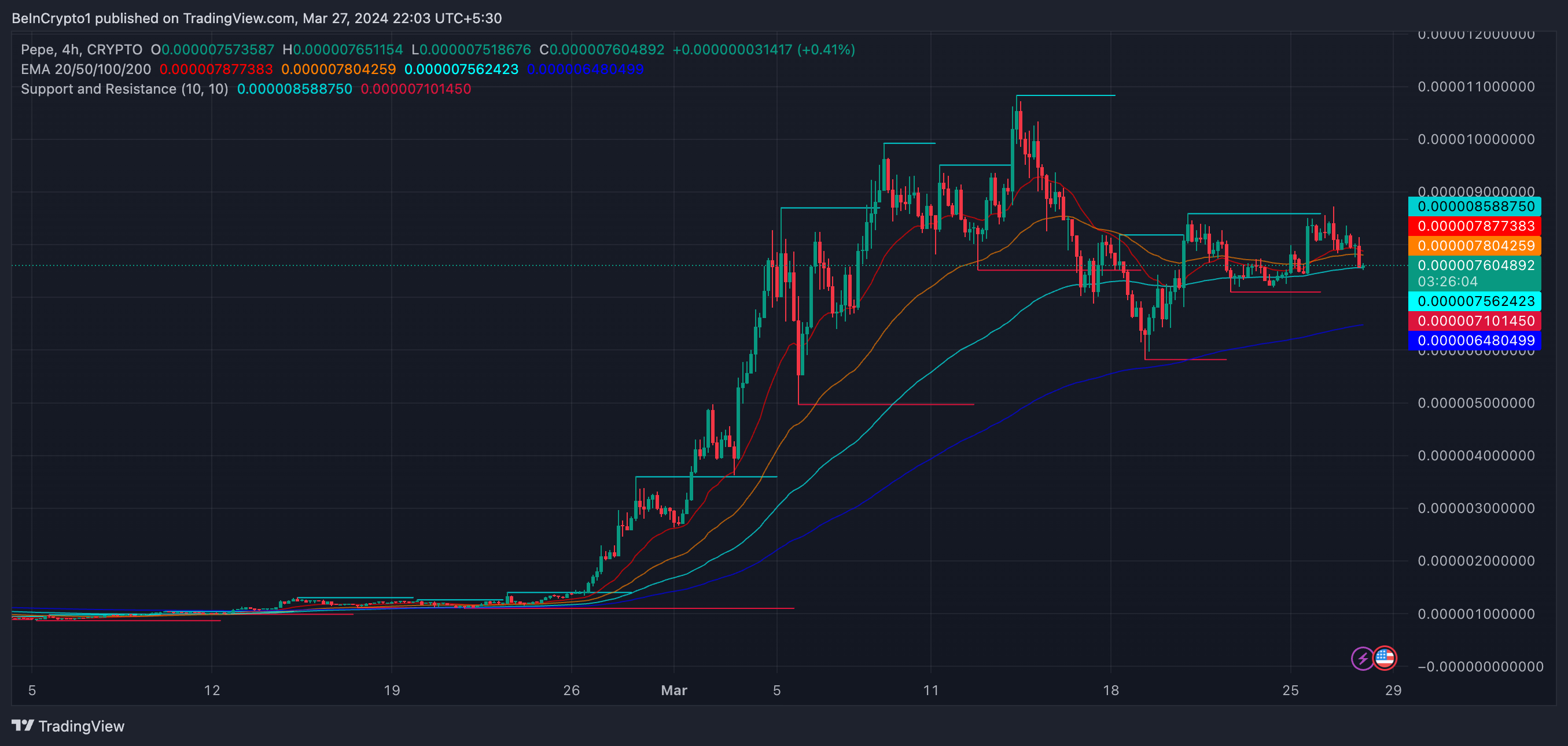 On March 14, PEPE reached its all-time peak, hitting a remarkable price of $0.0000106. Since reaching this pinnacle, it has encountered challenges in maintaining its value above the $0.0000080 mark, showing signs of struggle in the market.