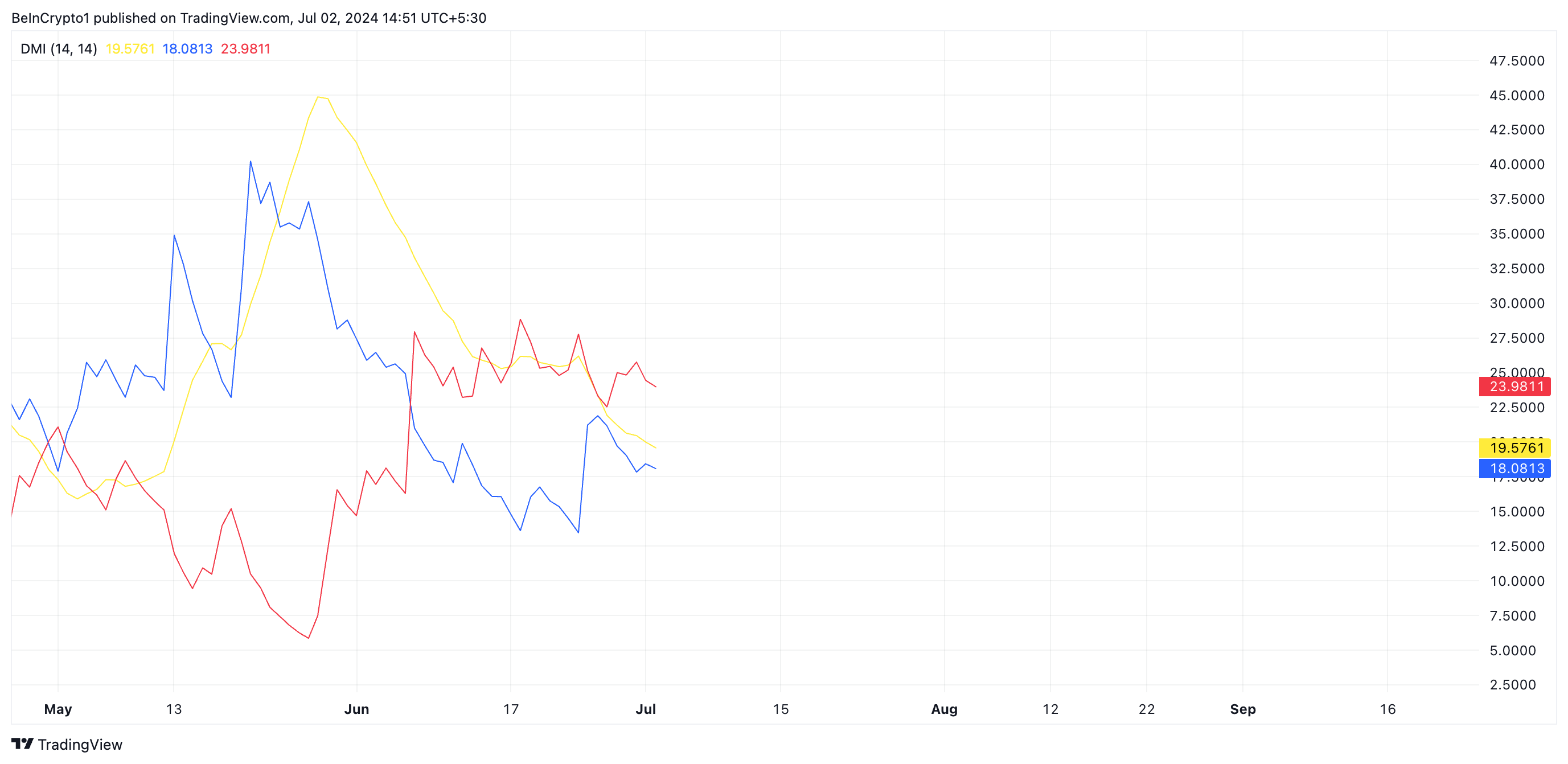 An asset’s DMI determines the direction of its market trend. When set up this way, it signals that the price downtrend is stronger than any upward price movement. It is indicative of a continuation of a bearish trend.
