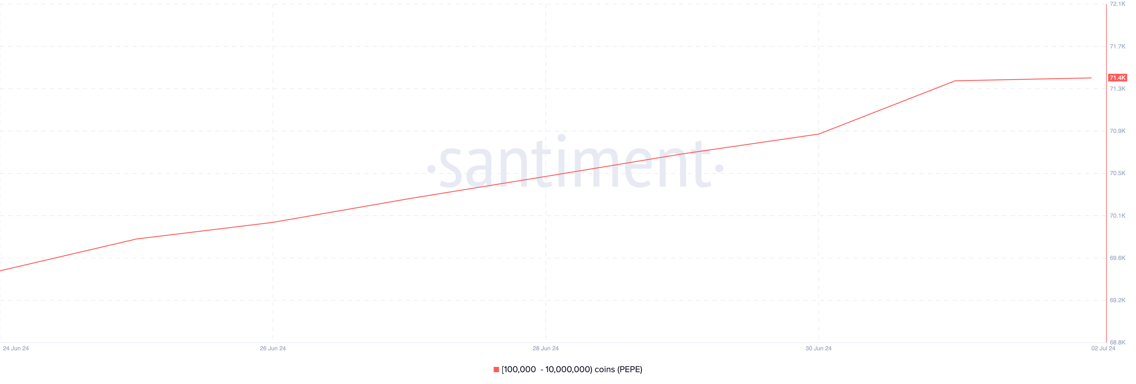 An assessment of Pepe (PEPE) whale activity revealed a spike in accumulation by investors that hold between 100,000 and 10,000,000 tokens. As of this writing, this cohort of PEPE investors holds 71,439 PEPE tokens.