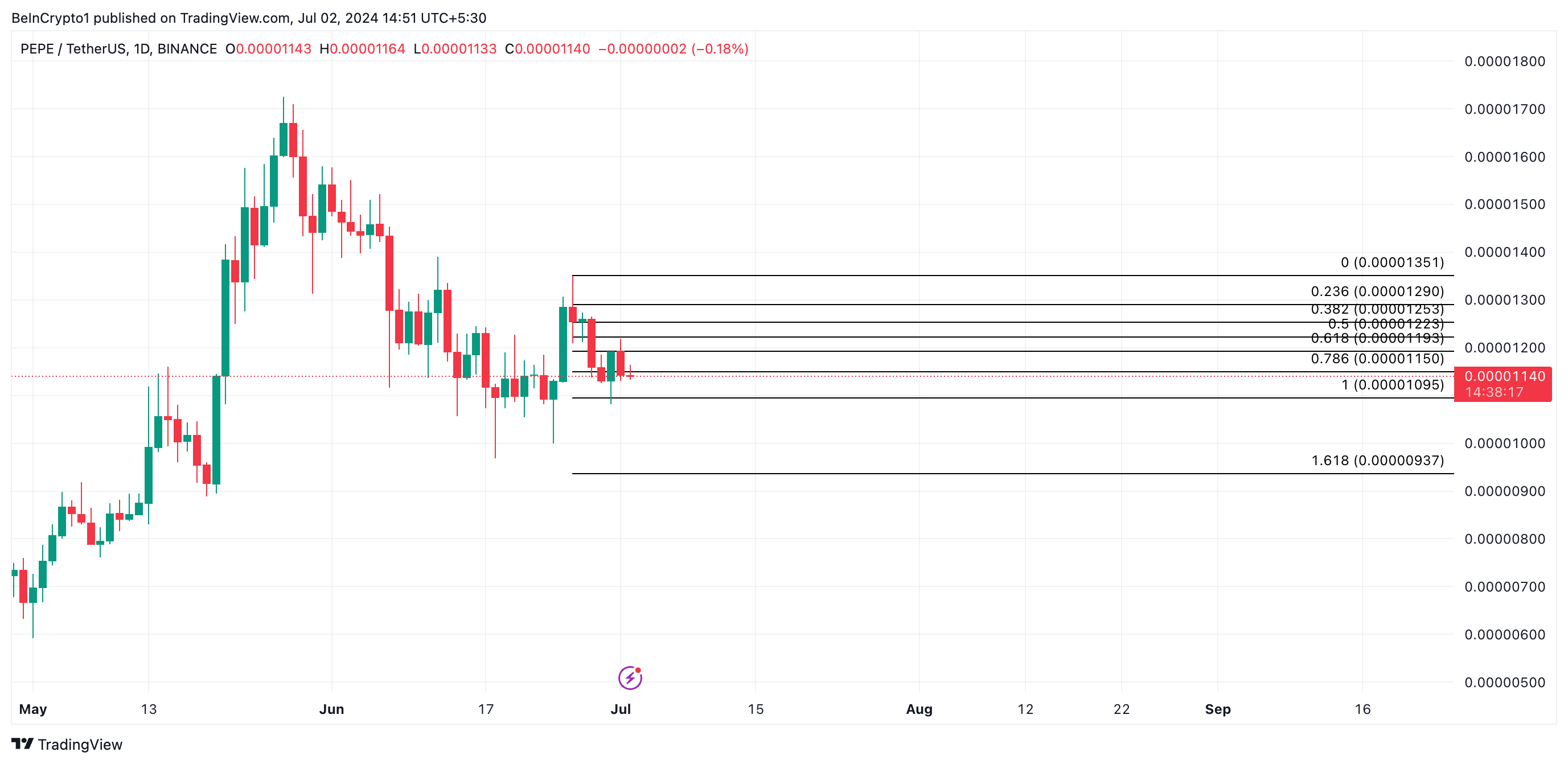 If PEPE’s month-long decline continues, its price might fall to $0.000010.