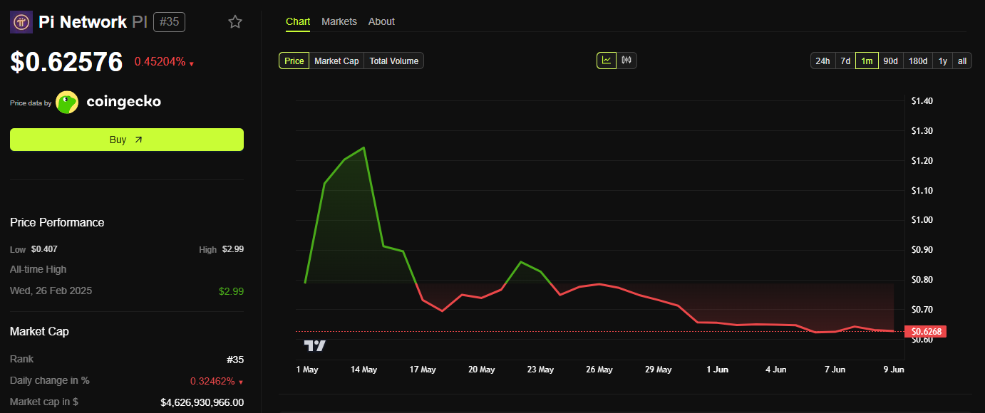 The first is the internal value within the Pi ecosystem, called the Global Consensus Value (GCV), which is set at around $314,159—symbolically inspired by the mathematical number Pi. The second is the price on exchanges, which, at the time of writing, is around $0.60.