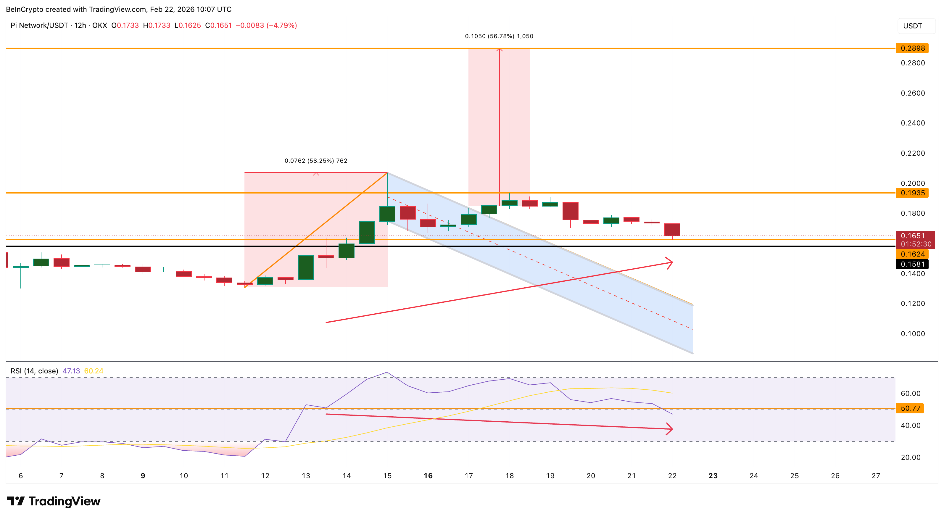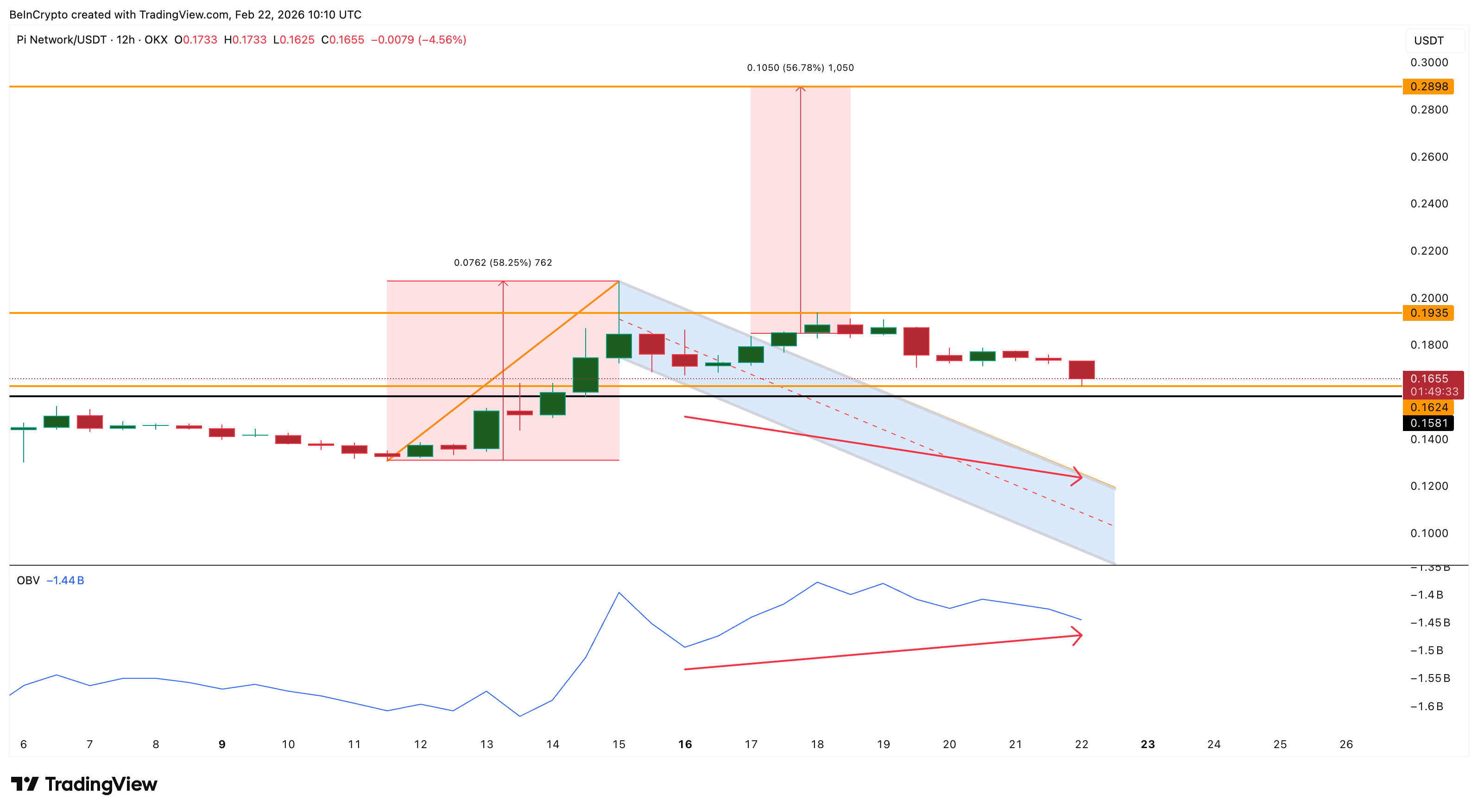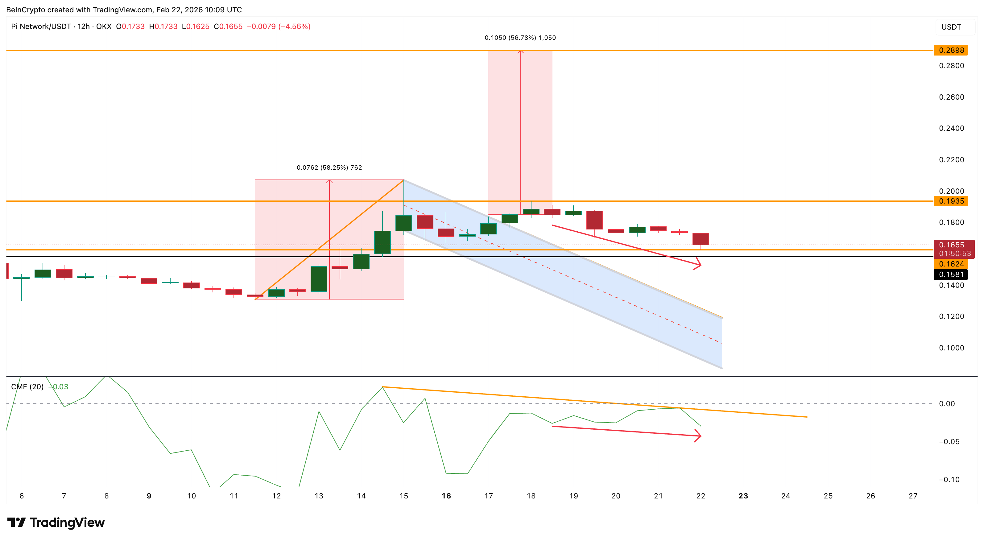 The Pi Coin price is struggling to recover after its recent breakout attempt collapsed. The token is trading near $0.16 after failing to hold gains above $0.19, a level it reached during a bullish flag breakout attempt on February 17. That breakout had projected a rally of nearly 60%, but the move quickly stalled.